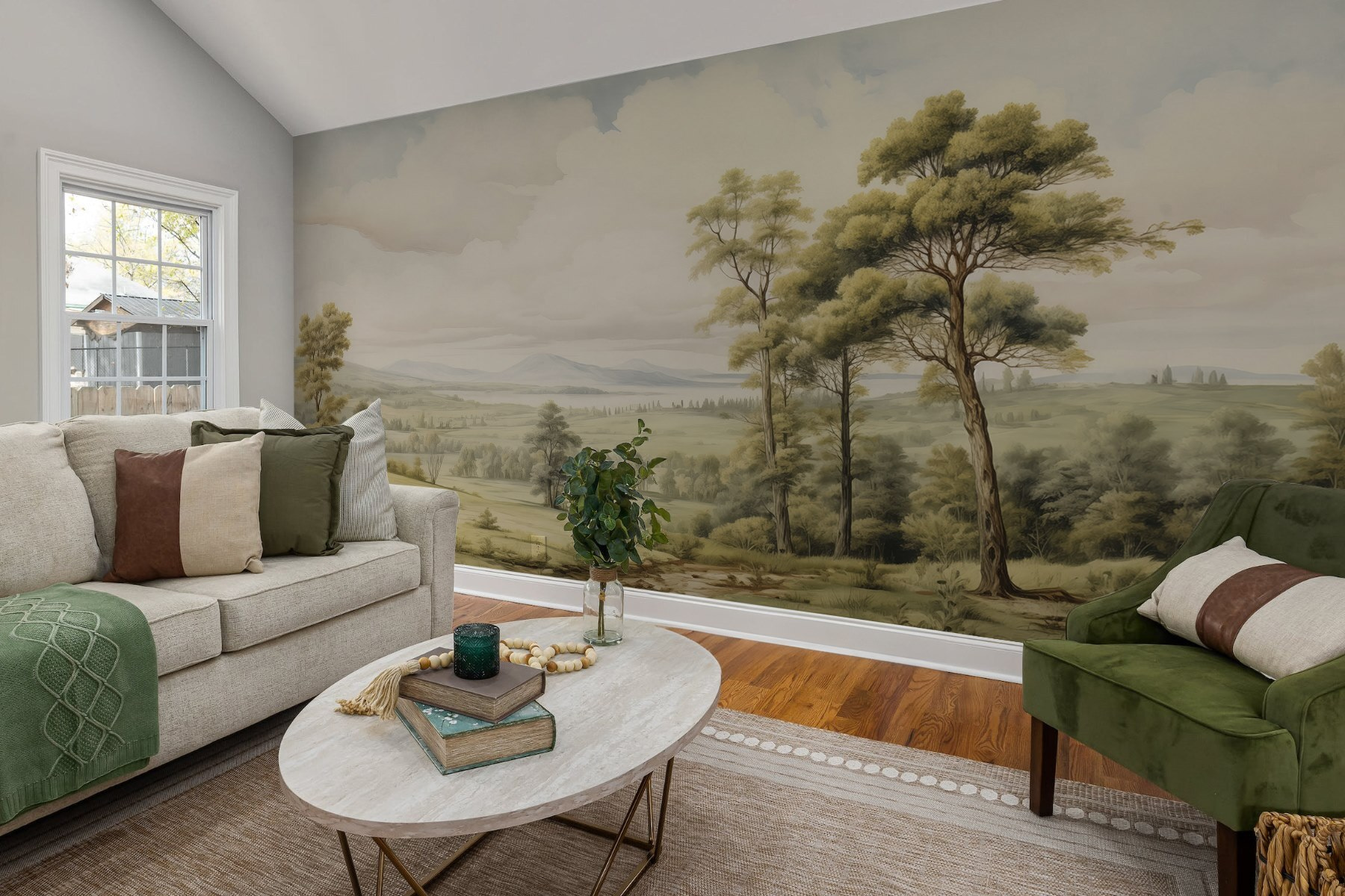 Transforma tu espacio con este impresionante mural «Paisaje con árboles y colinas». Imagínate adentrándote en un paisaje sereno, donde las suaves colinas se encuentran con los imponentes árboles: justo lo que necesita una habitación para darle ese toque de naturaleza. Es como llevar el aire libre al interior sin preocuparse por regar las plantas o los molestos insectos. Imagínese un rincón acogedor para leer donde este mural sea el telón de fondo perfecto, o tal vez un comedor que parezca un elegante picnic. Los colores suaves relajan y estimulan la conversación. Es posible que sus amigos incluso le pregunten si pueden mudarse allí. Es una decoración que invita a soñar y a contar historias, ¿a quién no le gusta eso? ¡Prepárese para dar nueva vida a sus paredes!