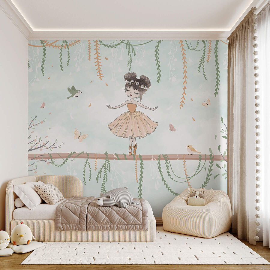 ¡Imagina una escapada fantástica en tus paredes! Este encantador mural muestra a una adorable niña bailando sobre una rama, rodeada de mariposas revoloteando y pájaros curiosos. El suave fondo en tonos pastel crea un ambiente sereno, haciendo que cualquier habitación parezca un bosque de ensueño. Es perfecto para despertar la imaginación de los más pequeños o simplemente para añadir un toque mágico a una guardería o sala de juegos. Imagina cómo la hora del cuento se convierte en una aventura mientras los niños contemplan esta escena encantadora, completamente absortos en su dulzura. En serio, ¿quién no querría girar felizmente junto a ella? ¡Un toque de alegría para paredes que piden una sonrisa!
