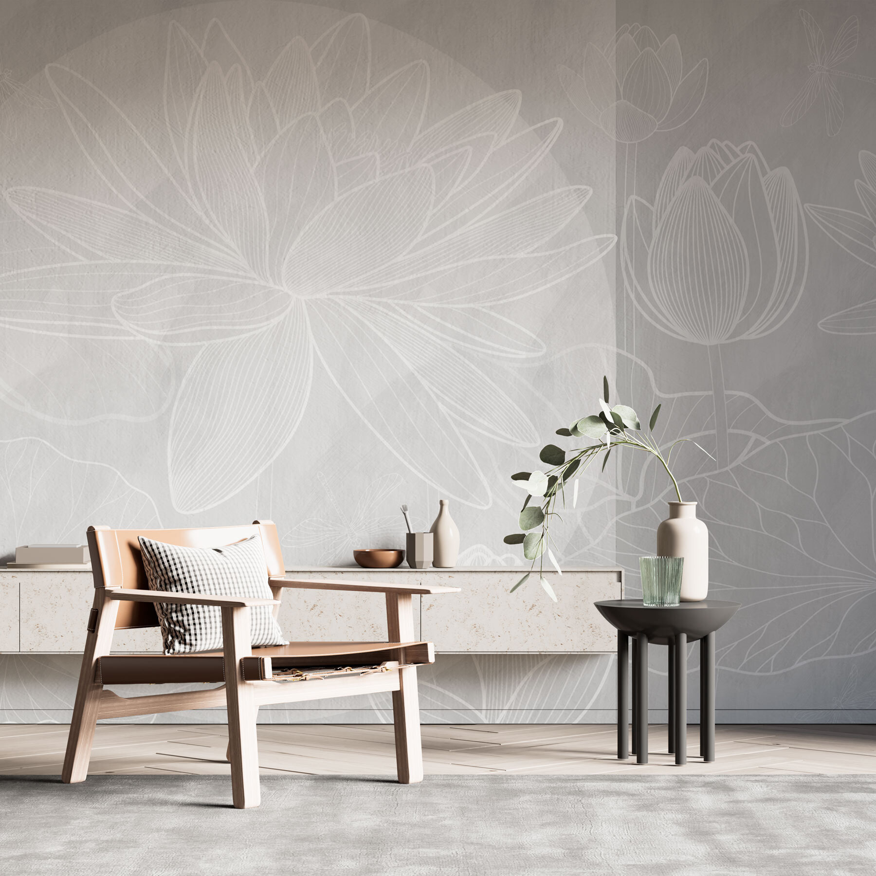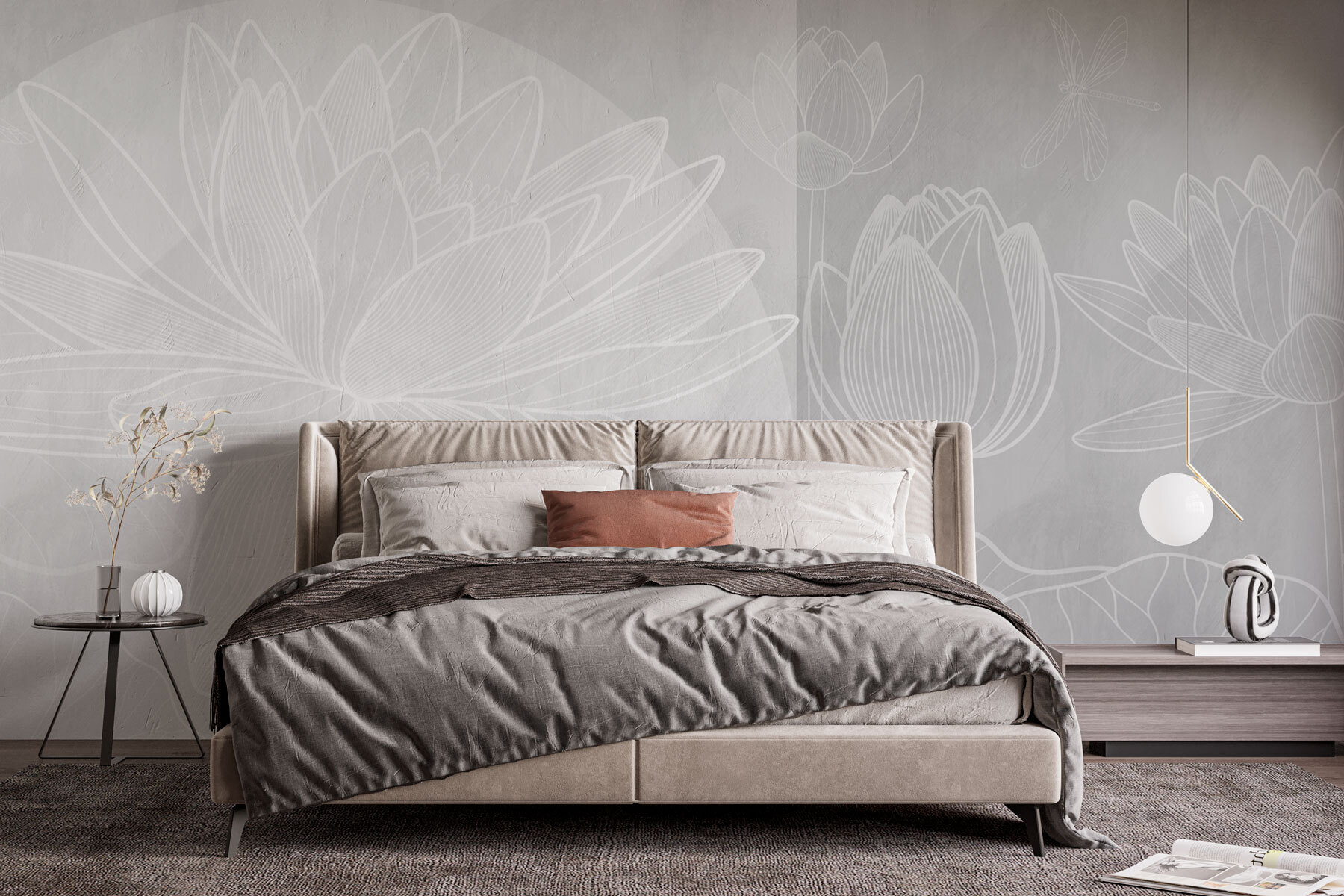 Transforma cualquier estancia en un oasis de serenidad con este impresionante mural decorativo, con delicadas flores blancas sobre un suave fondo gris. ¡Es como llevar un tranquilo jardín al interior, sin el polen! Imagínate acurrucándote con un buen libro, con la luz del sol filtrándose y haciendo bailar los contornos de las flores en tus paredes. Perfecto para un dormitorio o un rincón de lectura tranquilo, añade un toque de elegancia sin resultar excesivo. Además, ¿esas sutiles tonalidades? Son básicamente un tono neutro que inspira calma. ¿Quién diría que el arte floral podía ser tan refrescante?