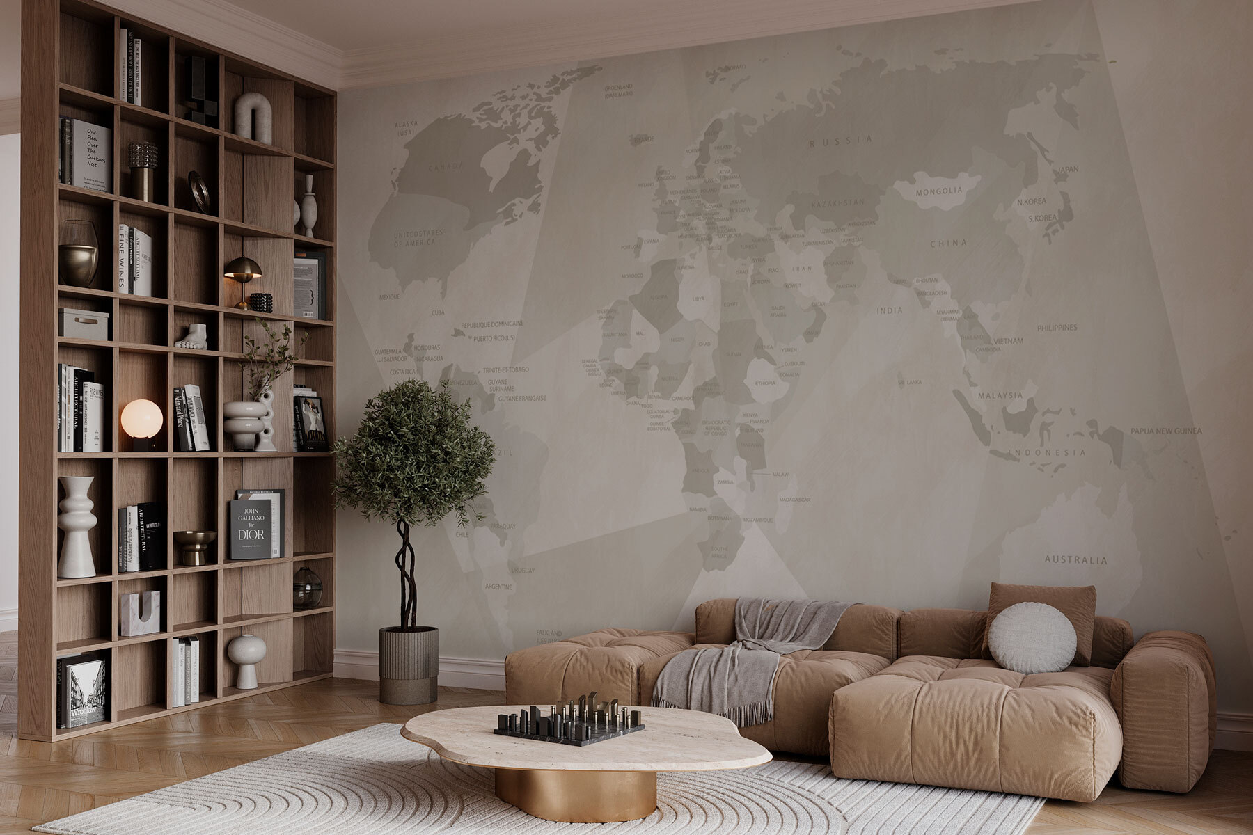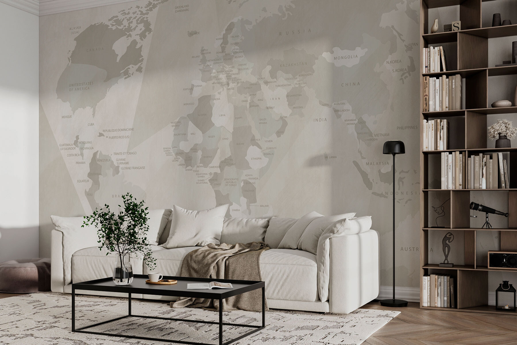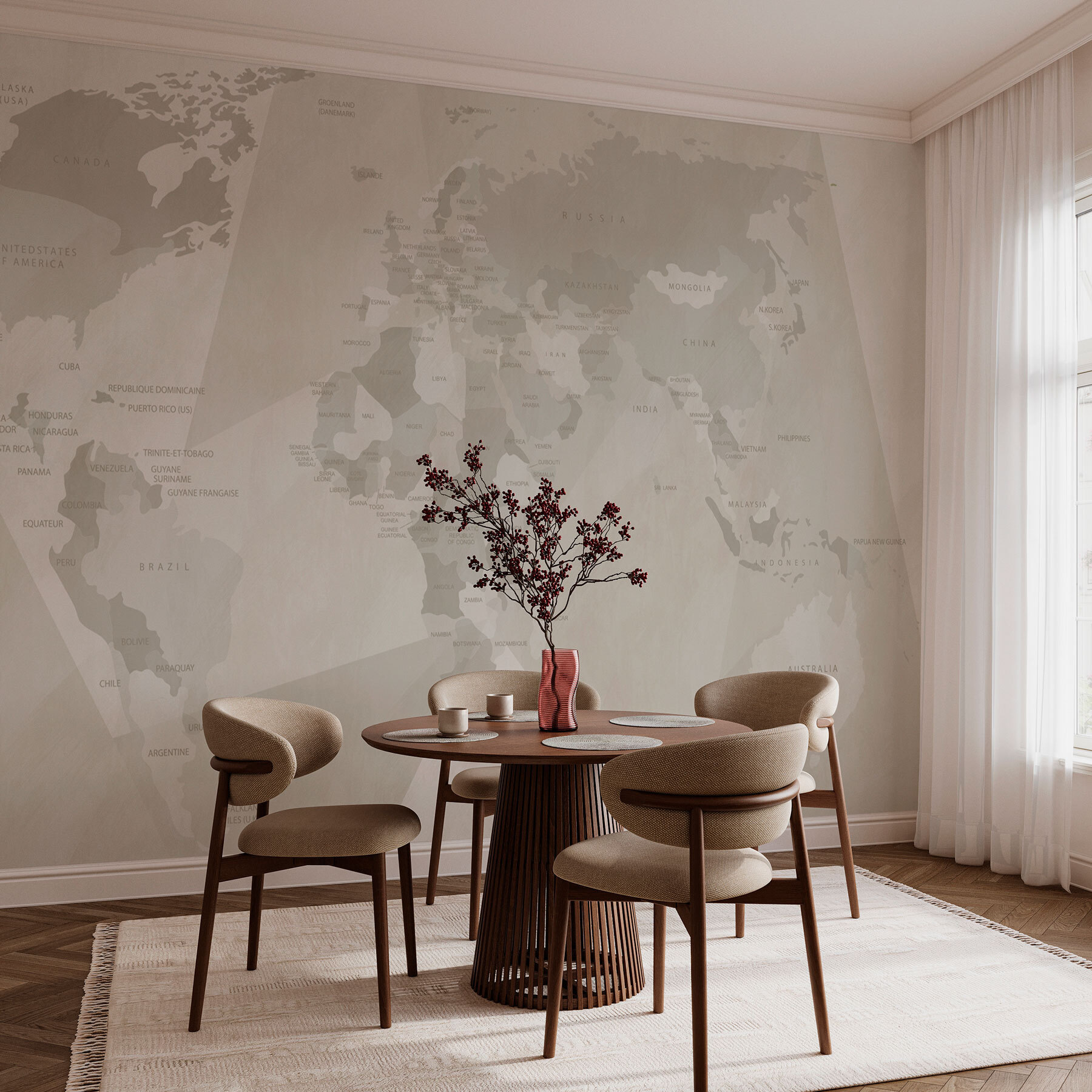 Transforma cualquier habitación en un paraíso para los trotamundos con el «Mural de pared Mapa del mundo». Imagínate tomando un café en tu salón y allí está: un atractivo mapa del mundo esperando a despertar tu pasión por los viajes. La suave paleta de colores combina a la perfección con cualquier decoración, aportando un toque fresco y clásico a la vez.