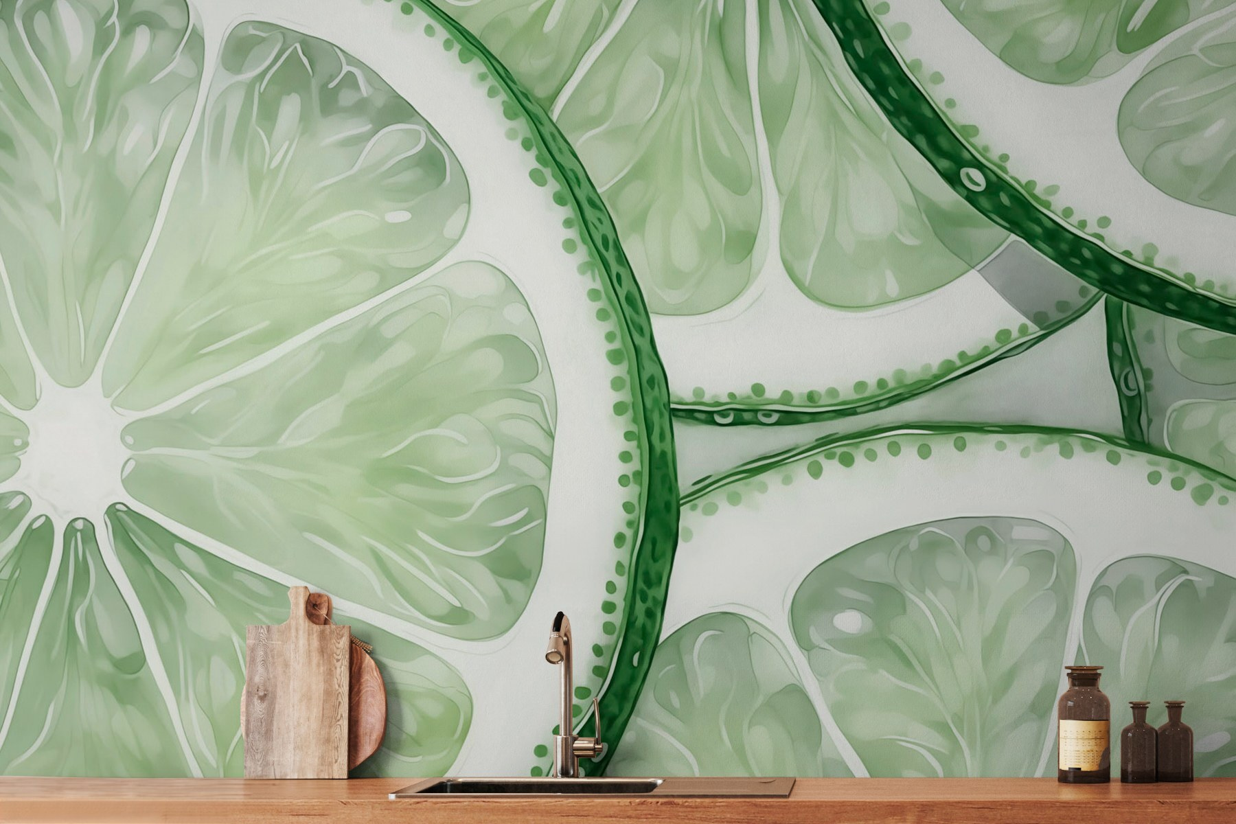 Aporta un toque picante a tu espacio con este encantador mural de rodajas de lima fresca apiladas. Es luminoso, alegre y perfecto para animar una cocina o un comedor. Imagina que organizas una cena: prepara el escenario para las risas, la buena comida e incluso unas margaritas. Los verdes vibrantes y los detalles intrincados hacen que parezca que estás entrando en un mercado de frutas. Además, las limas tienen algo muy refrescante: aportan energía sin resultar abrumadoras. Perfecto para cualquiera que crea en el poder de un ambiente alegre. Disfrute de la explosión de creatividad que aporta este mural y vea cómo sus paredes se transforman en un animado tema de conversación.