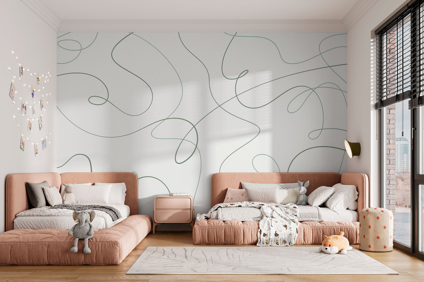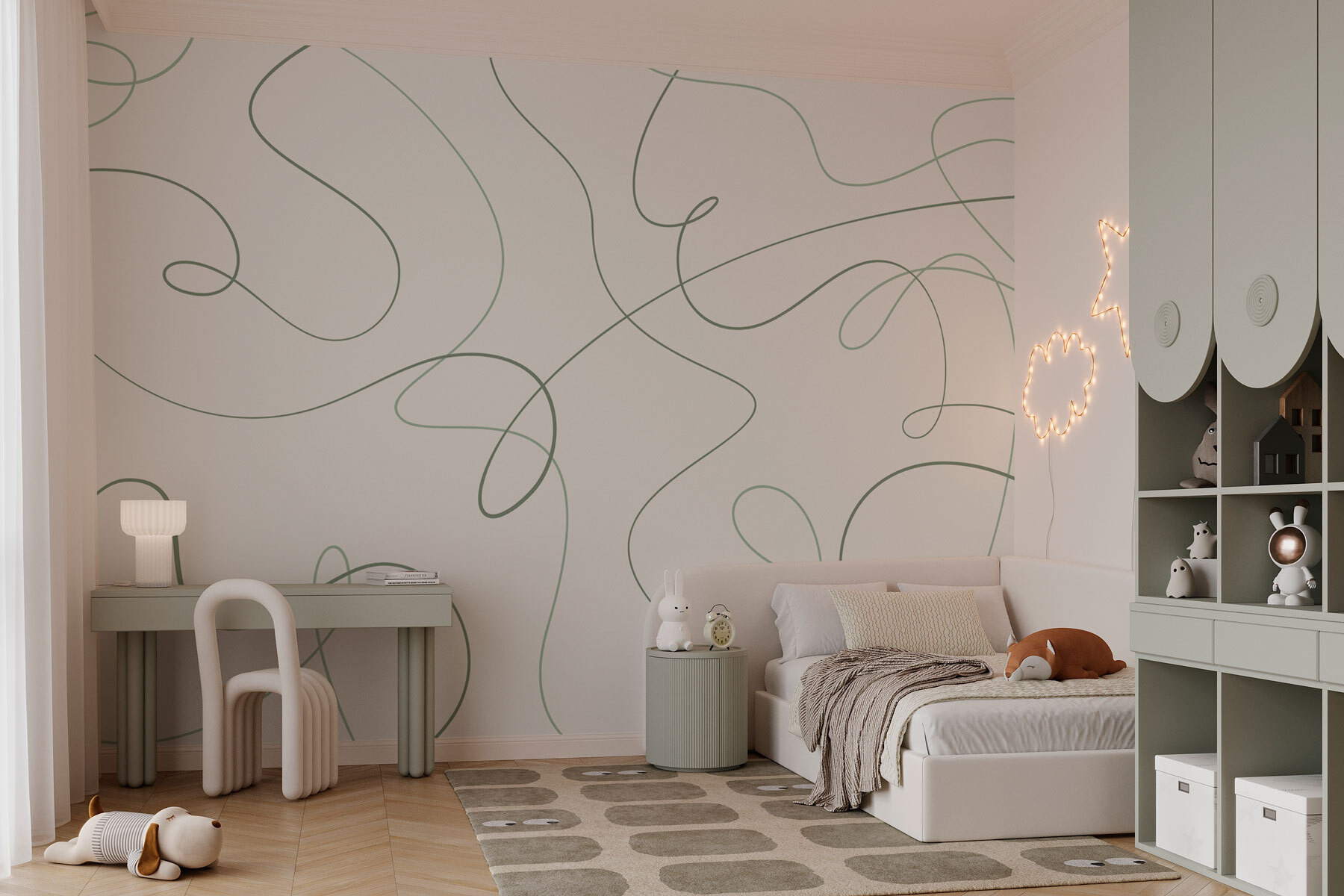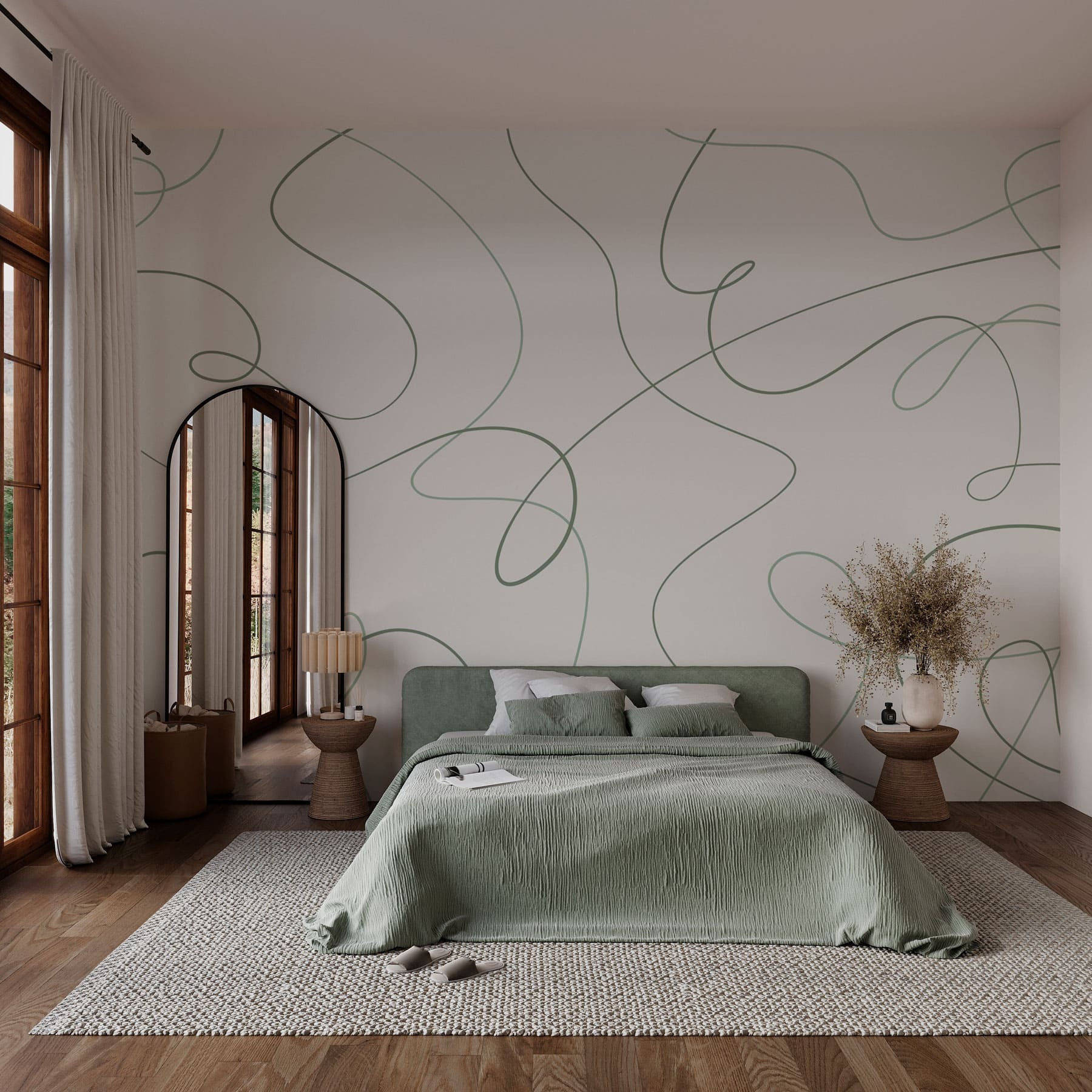 Presentamos un mural que transmite la sensación de una suave brisa en un día soleado: «Líneas verdes sobre fondo blanco». Este diseño abstracto baila con elegancia por tus paredes, creando un ambiente relajante que invita al descanso. Imagínese un rincón acogedor para leer o un comedor animado transformado en un oasis de elegancia moderna. ¿Esas sinuosas líneas verdes? No son solo decoración, son una invitación a soñar despierto, a dejar volar la imaginación. Es como tener una obra de arte que sabe cómo alegrar el ambiente. ¡Perfecto para aquellos que aprecian un toque de fantasía en sus vidas!