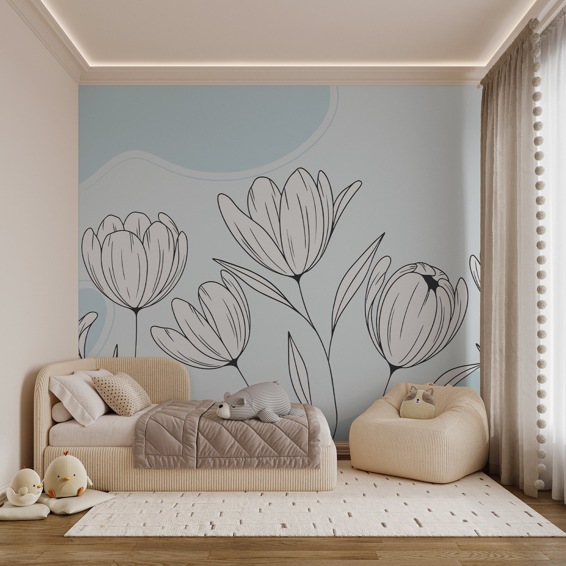 Aporte un toque de naturaleza al interior de su hogar con los «Murales de flores dibujadas a mano». Imagínese despertarse cada mañana con una pared adornada con elegantes flores dibujadas a mano que parecen mecerse con la suave brisa. Es como tener un jardín en su salón, ¡pero sin tener que quitar las malas hierbas!