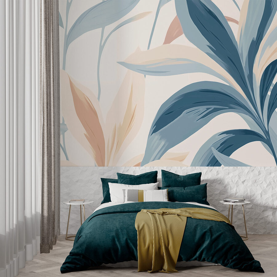 ¿Quieres dar un toque natural a tu hogar? Este mural, con su diseño abstracto de hojas de ensueño, puede ser justo lo que necesitas. Imagínate entrar en una habitación y ser recibido por suaves tonos azules y tierra. Es como estar en un prado abierto, pero sin los molestos insectos, ¡todo son ventajas!