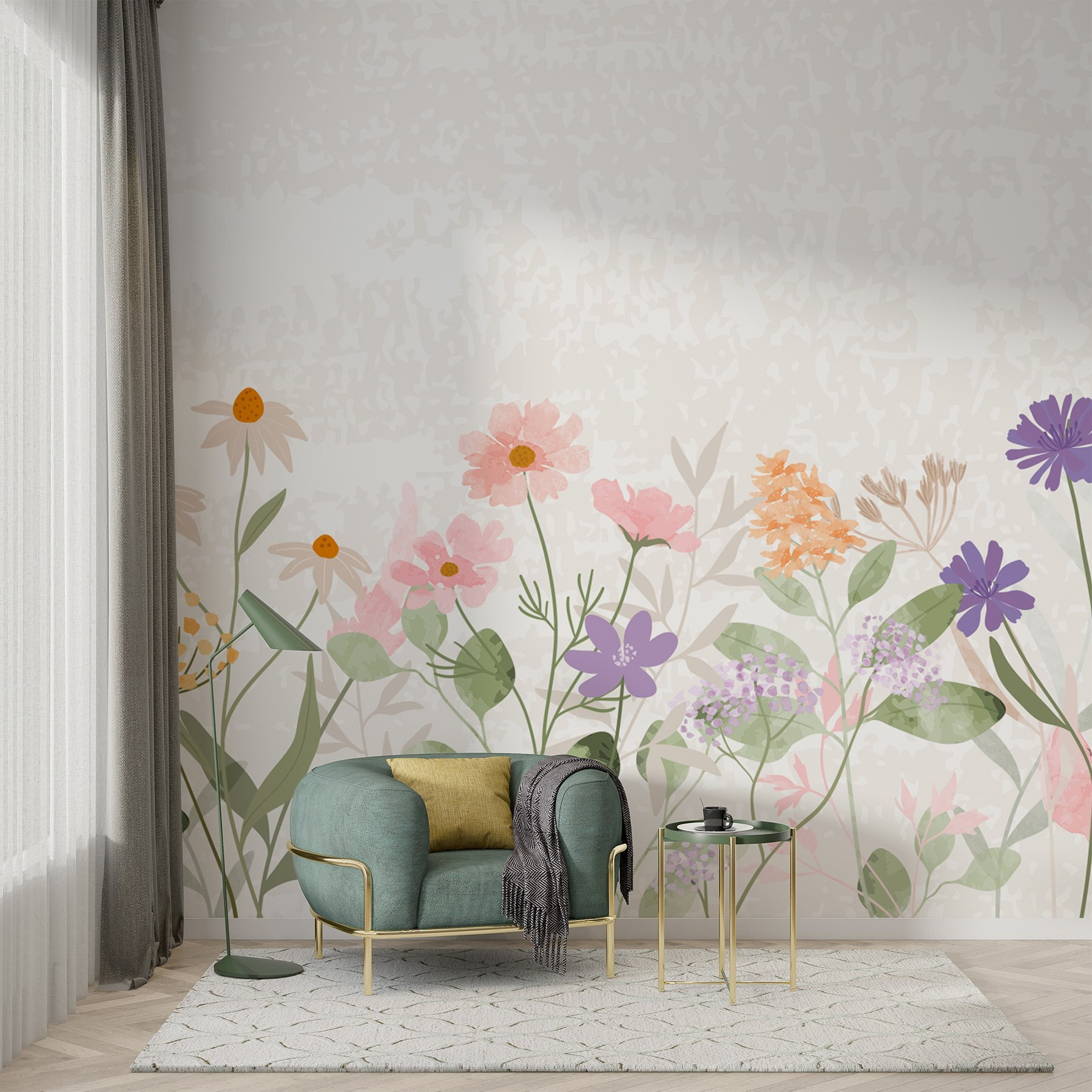 Transforma cualquier espacio con este encantador mural «Row of Flowers with Leaves» (Rama de flores con hojas). Aporta un precioso toque de color y un aire natural a tu hogar. Imagínate despertarte cada mañana con estas suaves flores acuareladas que te alegran el ánimo al instante: ¡todo un cambio radical para esas mañanas de sueño!