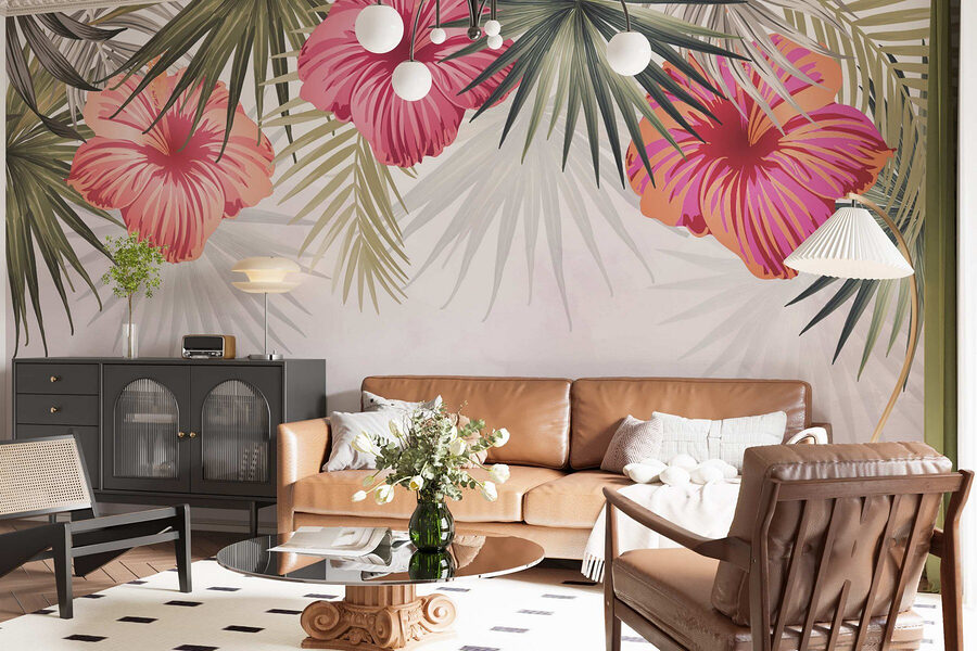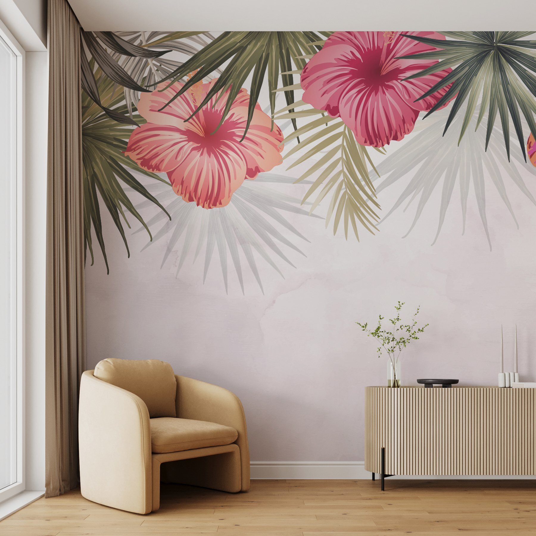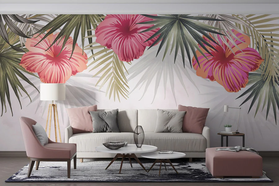 Transforma cualquier habitación en un paraíso tropical con este impresionante mural de flores rosas entremezcladas con exuberantes hojas verdes. Es como tener un pedacito de naturaleza en tu hogar, perfecto para alegrar un espacio aburrido. Imagina tomarte el café de la mañana rodeado de estas vibrantes flores, ¡quizás incluso te inspire a soñar despierto! Los colores resaltan sobre un fondo suave, lo que lo convierte en una pieza llamativa sin llamar la atención. Claro, las plantas necesitan riego, ¡pero esta belleza requiere poco mantenimiento! Perfecto para aquellos que buscan un toque de aire libre, sin preocuparse por el cuidado de las plantas. Así que, ¡adelante, deja que tus paredes florezcan!