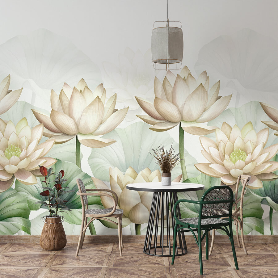 Transforma cualquier estancia en un remanso de paz con este encantador mural de delicadas flores blancas y exuberantes hojas verdes. Imagínate entrar en un espacio que parece un jardín bañado por la luz del sol, donde esos suaves pétalos parecen mecerse con la suave brisa. El estilo acuarela añade un toque de ensueño, perfecto para alegrar paredes apagadas o crear un rincón acogedor. ¡Tus invitados lo notarán sin duda! Transmite una sensación de calma: imagina recibir a tus amigos para tomar el té y escuchar solo elogios mientras admiran tu decoración única y preciosa. ¡Deja que este mural sea el soplo de aire fresco que tu hogar necesita!