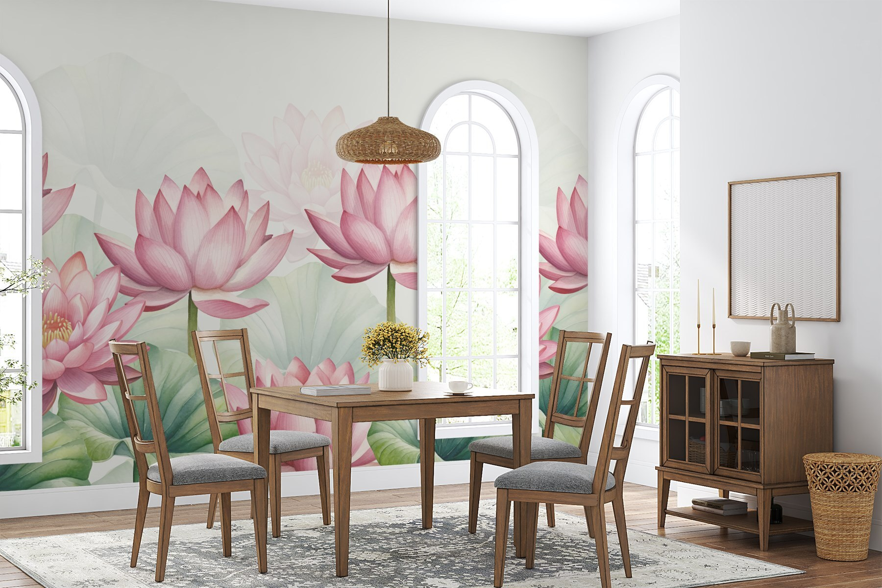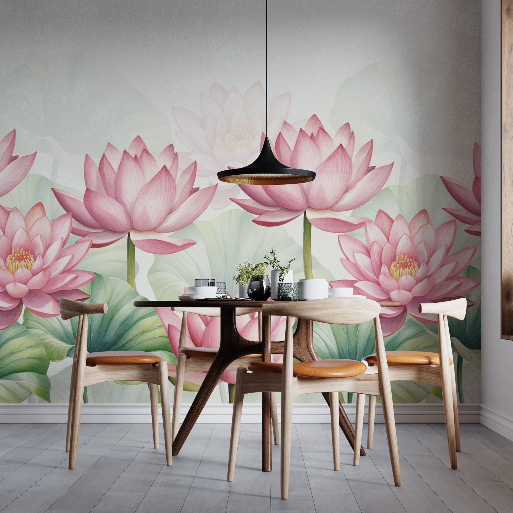Transforma cualquier espacio con este encantador mural de flores rosas salpicadas de suaves hojas verdes. Es como tener un jardín en casa, sin la regadera ni las molestas abejas. Imagínatelo: una acogedora sala de estar donde estas vibrantes flores son el centro de atención, desatando la alegría e invitando a todo el mundo a hacer cumplidos. El efecto acuarela aporta un toque suave, creando una atmósfera serena que parece una escapada de ensueño. Perfecto para un dormitorio o un rincón alegre: un poco de encanto que susurra “relájate y disfruta” cada vez que lo miras.