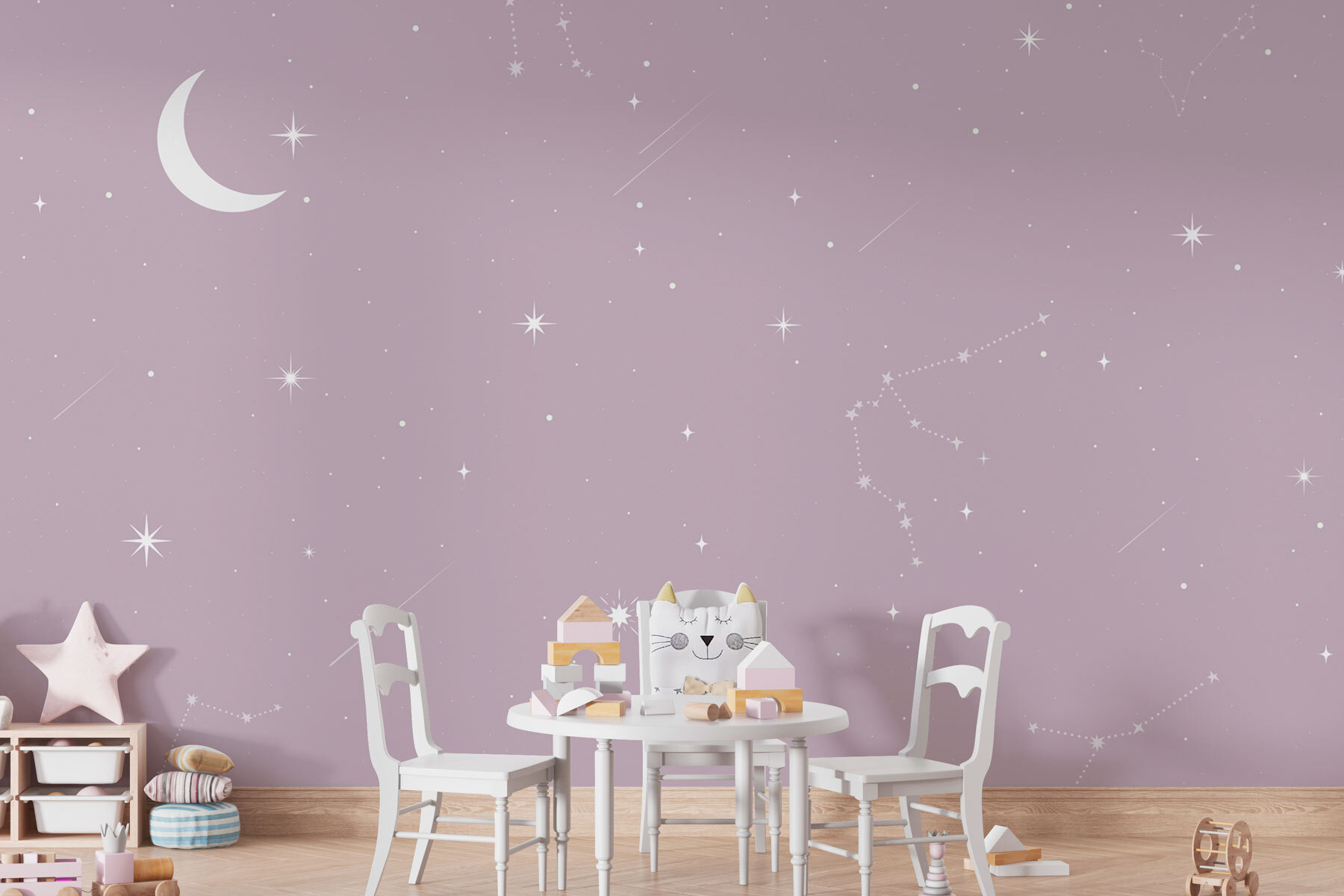 Transforma tu espacio en un refugio de ensueño con el mural «Luna y estrellas en el cielo». Imagínate acurrucado con una manta, tomando té y contemplando un tranquilo cielo nocturno, todo ello desde la comodidad de tu salón. ¡Es como tener un poco de luz de las estrellas en tus paredes! Los tonos suaves y las elegantes constelaciones invitan a la calma, lo que lo hace perfecto para relajarse después de un largo día o para inspirar la creatividad. Además, ¿a quién no le gusta un poco de encanto celestial? Ideal para dormitorios, habitaciones infantiles o cualquier lugar al que le venga bien un toque de magia. No es solo decoración, es un billete a una noche estrellada, ¡sin mosquitos!