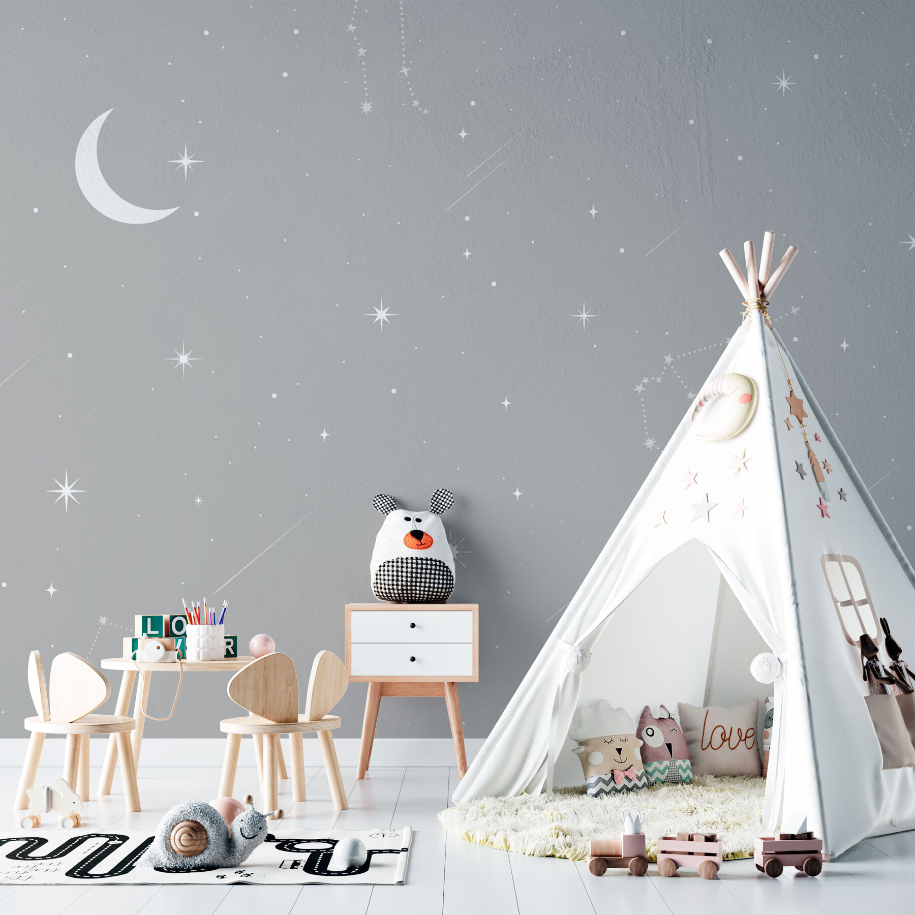 Transforme una habitación sencilla en una escapada de ensueño con el mural Cielo gris con estrellas y luna. Imagina que entras en tu habitación y te recibe un sereno cielo nocturno, con estrellas parpadeantes y una suave luna. Es como invitar a un poco de magia en el interior. Perfecto para esas acogedoras tardes tomando el té o charlando hasta tarde bajo las estrellas, sin el aire frío. Además, ¿a quién no le gustaría contemplar las constelaciones mientras descansa en el sofá? Eleva tu decoración sin esfuerzo y disfruta de un toque del cosmos en casa.