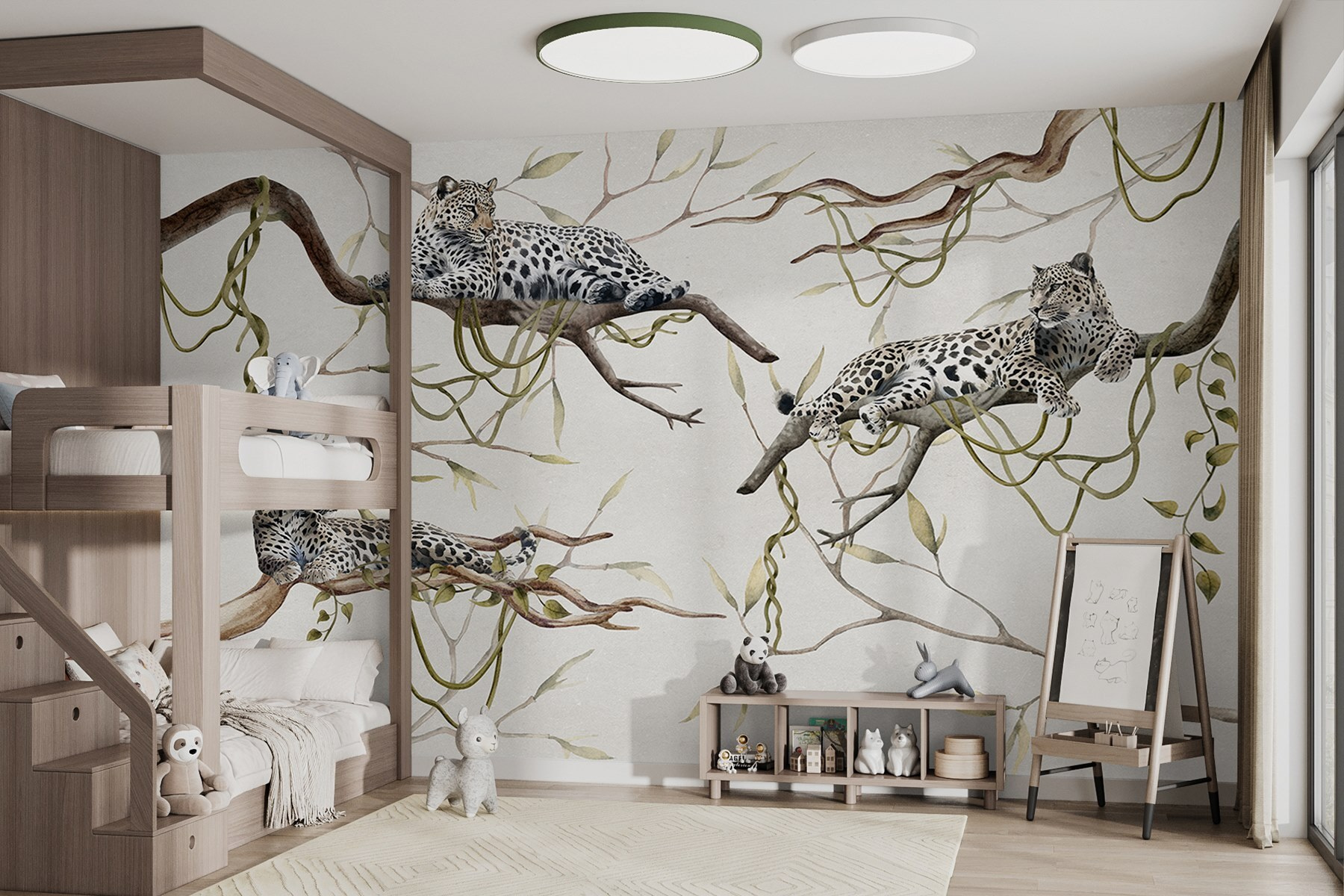 Transforma tu espacio en un oasis salvaje con este impresionante mural que muestra un grupo de leopardos descansando sobre las ramas. Imagina entrar en la habitación y sentir cómo la esencia de la naturaleza te envuelve: esos patrones de manchas y poses elegantes acaparan toda la atención. Perfecto para ese rincón que necesita un poco de espíritu, o tal vez para despertar envidia en tu próxima reunión del club de lectura. Es como tener un pedazo de la selva en casa, pero sin mosquitos. Además, ¿quién no querría despertarse con estas majestuosas criaturas? Se trata de crear un ambiente armonioso, ¿no?
