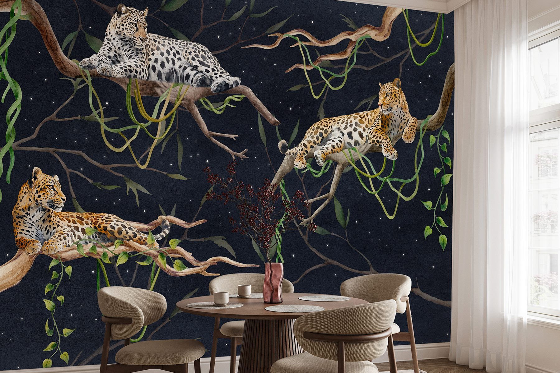 Transform your walls into a wild oasis with this stunning mural of leopards lounging gracefully on branches. It’s like inviting a piece of the jungle right into your living room—without the humidity or pesky mosquitoes! Imagine sipping your morning coffee while they keep you company, looking oh-so-casual and effortlessly cool. The rich colors and intricate details are a feast for the eyes, perfect for adding a touch of elegance to any space. Whether you’re a nature lover or just someone who appreciates unique art, this mural’s warmth and charm can spark conversations and bring a cozy vibe. Plus, who wouldn’t want a trio of leopards hanging around? They might just become the new focal point of your home!