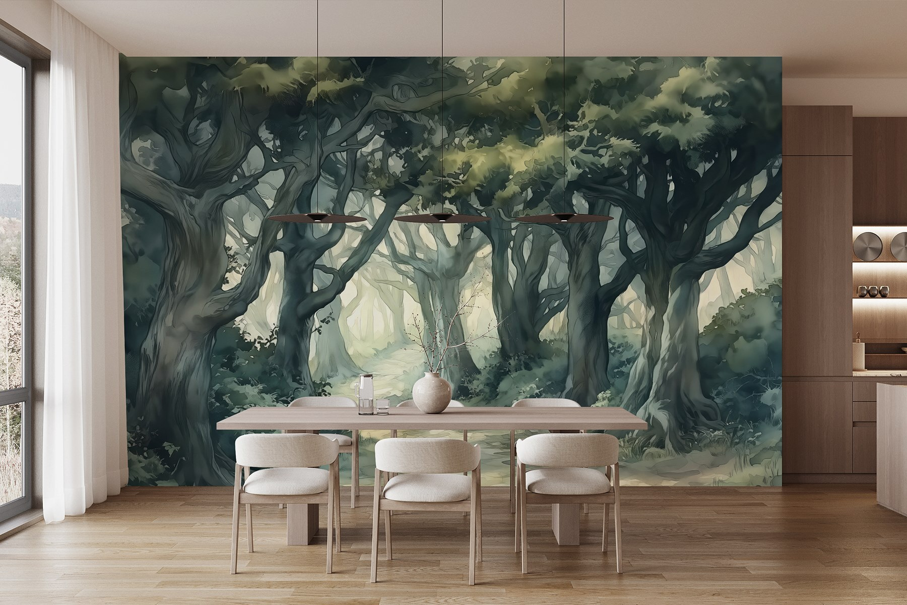 Los tonos suaves y los árboles detallados crean un ambiente tranquilo, ideal para un rincón de lectura acogedor o un dormitorio sereno. Imagina que te sientas con una taza de té y que la relajante escena te envuelve como un cálido abrazo. ¿Y quién dijo que la naturaleza no puede volver a casa? Añada este mural y, de repente, soñar despierto con aventuras en el bosque se convertirá en algo cotidiano.