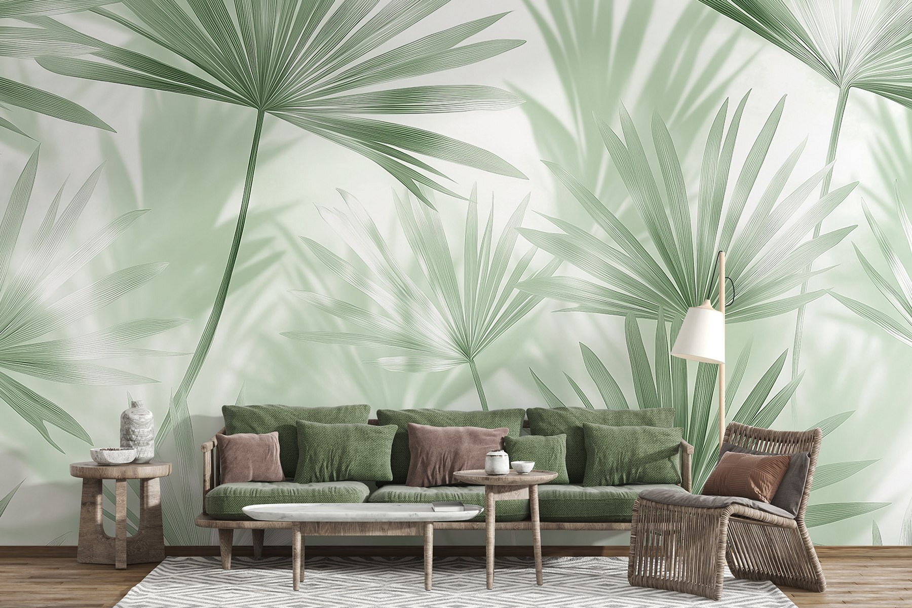 Transforma cualquier espacio en un oasis de serenidad con este mural de ensueño, «Tonos tierra suaves y follaje delicado». Imagínate rodeado cada día de relajantes tonos verdes y suaves texturas, perfectos para esos momentos en los que necesitas evadirte un poco o incluso inspirarte para tu próximo proyecto de bricolaje. Las delicadas hojas de palmera bailan juntas, creando la sensación de que una suave brisa recorre tu habitación, sin los insectos que siempre parecen colarse. Además, es agradable a la vista, sin colores fuertes ni diseños caóticos. Solo un cálido abrazo de la naturaleza que aporta tranquilidad, lo que hace difícil no sonreír mientras tomas un café o te relajas después de un largo día. ¡Prepárate para convertir tu pared en un tema de conversación que combina la belleza con un toque de tranquilidad tropical!
