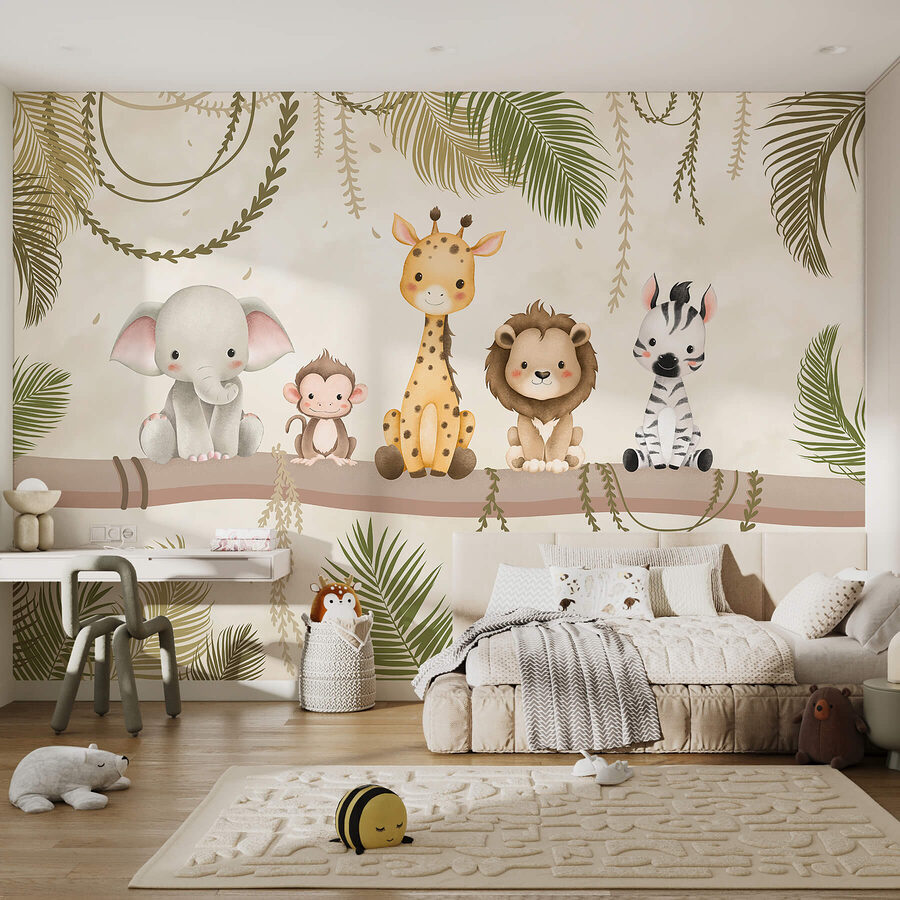 Transforma tu espacio en una vibrante jungla con este encantador mural que muestra un adorable grupo de amigos animales encaramados a una robusta rama. Imagínatelo: un mono descarado, un tierno elefante, una encantadora jirafa, un simpático león y una juguetona cebra, todos listos para aportar alegría y calidez a tus paredes. Es como tener un mini safari en casa. Perfecto para una habitación de juegos o un rincón acogedor, este mural invita a sonreír y despierta la imaginación. ¿A quién no le gustaría volver a casa con un montón de caras amistosas? Perfecto para niños de todas las edades, o simplemente para cualquiera que tenga un gran corazón para los animales.