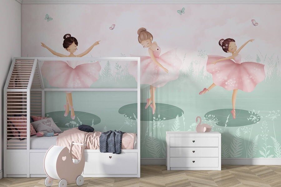 Transforma tu espacio con este encantador mural en el que aparece un encantador grupo de niñas bailando en un campo iluminado por el sol. Es como una escena sacada directamente de una ensoñación caprichosa, donde la risa llena el aire y las mariposas revolotean alrededor. Imagínate unos piececitos girando y revoloteando con esos suaves tutús rosas, evocando una sensación de alegría y espíritu despreocupado. Este mural es perfecto para la habitación de los más pequeños, ya que fomenta la creatividad y la imaginación. Imagínese las sonrisas y los cuentos que podrían tener lugar aquí, con los pequeños bailarines compartiendo sus propias aventuras de diversión y amistad. Un toque de felicidad para cualquier pared.