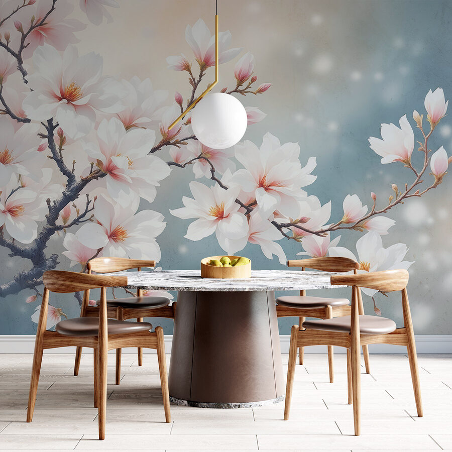 Transforma tu espacio con este mural de ensueño, «Árbol con flores blancas». Imagina entrar en un paisaje sereno donde delicadas flores bailan en las ramas, susurrando secretos de primavera. Los suaves tonos acuarelados crean una atmósfera acogedora, perfecta para rincones acogedores o para alegrar una pared aburrida. Es como tener el encanto de la naturaleza en el salón, ¡pero sin el polen!