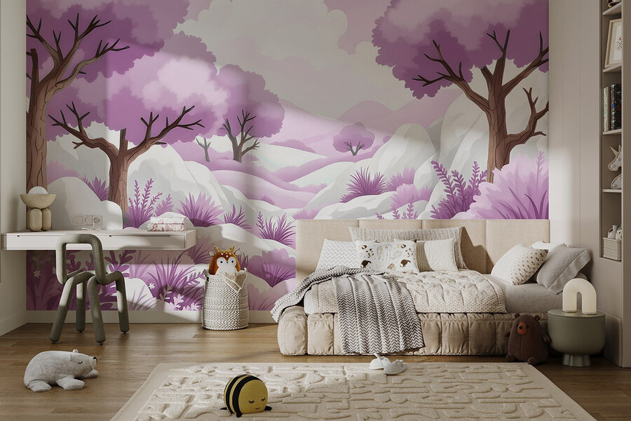 Transforma cualquier habitación en un refugio de ensueño con este encantador mural «Paisaje con árboles y nieve». Imagínate entrando en un bosque fantástico, donde suaves árboles de lavanda se mecen suavemente, rodeados de nieve esponjosa y delicadas plantas. ¡Es como un mundo mágico donde el invierno se lleva bien con la primavera!