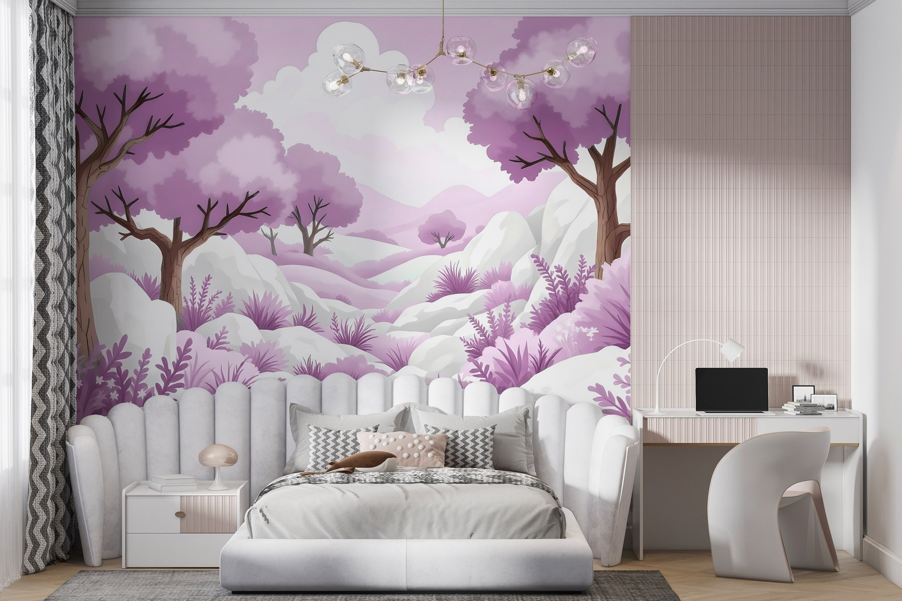 Transforma cualquier habitación en un refugio de ensueño con este encantador mural «Paisaje con árboles y nieve». Imagínate entrando en un bosque fantástico, donde suaves árboles de lavanda se mecen suavemente, rodeados de nieve esponjosa y delicadas plantas. ¡Es como un mundo mágico donde el invierno se lleva bien con la primavera!