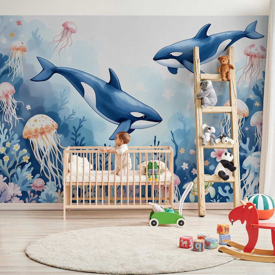 Transforma tu espacio en un maravilloso mundo submarino con este encantador mural decorativo en el que aparecen ballenas y una juguetona tortuga retozando en las vibrantes aguas del océano. Imagínate entrar en una habitación donde las medusas flotan perezosamente y los coloridos corales se mecen como si estuvieran bailando. ¡Es como tener tu propio pedazo de mar en casa! Perfecto para crear un ambiente costero, este mural te hará soñar despierto con días de playa y brisas marinas. ¿Quién no sonreiría al ver a las tortugas ocupándose de sus asuntos en un mar de serenidad? Esta obra de arte no es solo decoración, es una invitación a escapar y explorar, ¡sin necesidad de equipo de buceo!
