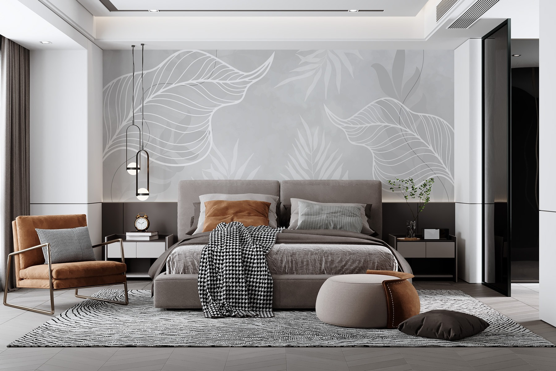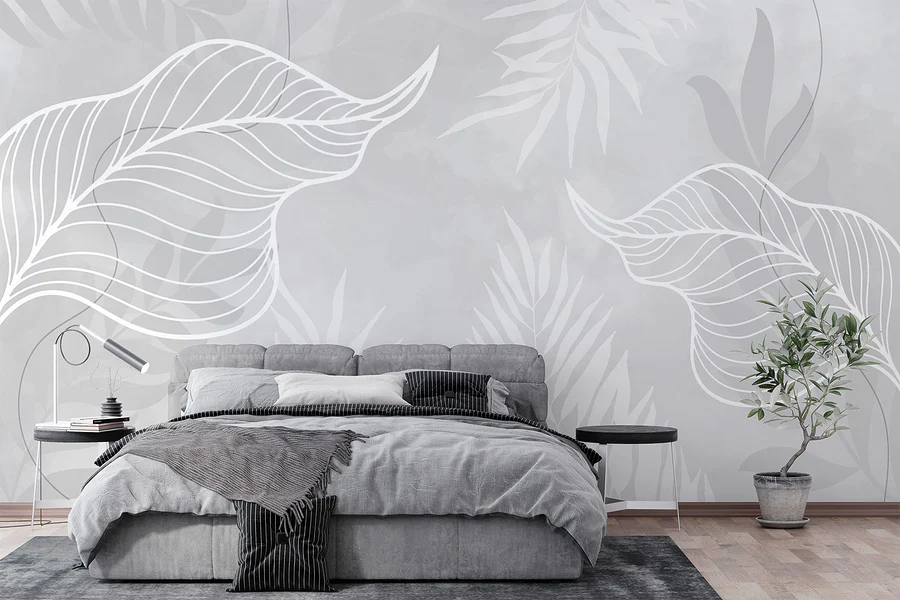 Transforme cualquier espacio con el intrigante encanto de este mural de pared con delicadas hojas blancas sobre un suave fondo gris. Imagínese entrar en una habitación acogedora donde esas siluetas de hojas bailan ligeramente contra la pared, creando un ambiente fresco y aireado. Es como traer el exterior al interior, perfecto para pasar las tardes tomando café o recibiendo a los amigos. La sutil combinación de colores combina bien con la mayoría de estilos de decoración, lo que la convierte en una opción versátil. Tanto si buscas un ambiente tranquilo como un toque de elegancia, este mural aporta un toque único. Puede que incluso se sorprenda a sí mismo soñando despierto, contemplando por dónde pueden estar vagando esas caprichosas hojas.