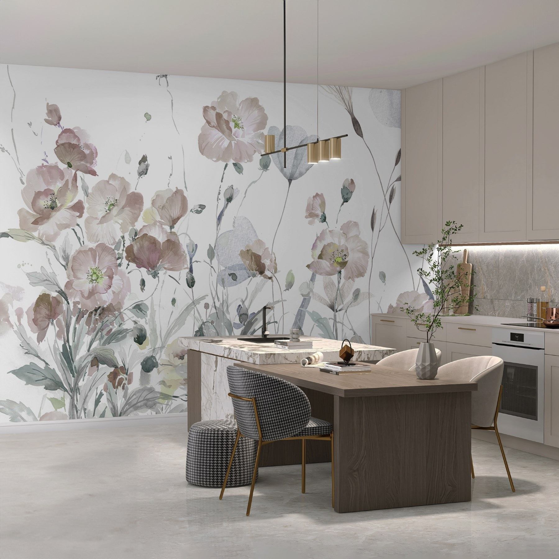 Transforma tu espacio en un jardín sereno con este encantador mural pintado con flores y hojas. Imagínate esto: entras en una habitación y, de repente, es como si te adentraras en una obra maestra de acuarela. Los suaves tonos pastel y las delicadas flores invitan a la calma, perfectos para un rincón de lectura acogedor o un dormitorio tranquilo. Es casi como si las flores susurraran palabras dulces. ¿Quién no querría eso? Además, crea un hermoso telón de fondo para tus rituales matutinos con café o tus charlas nocturnas. Añade este mural y deja que la belleza de la naturaleza ilumine tu día, ¡todos los días!