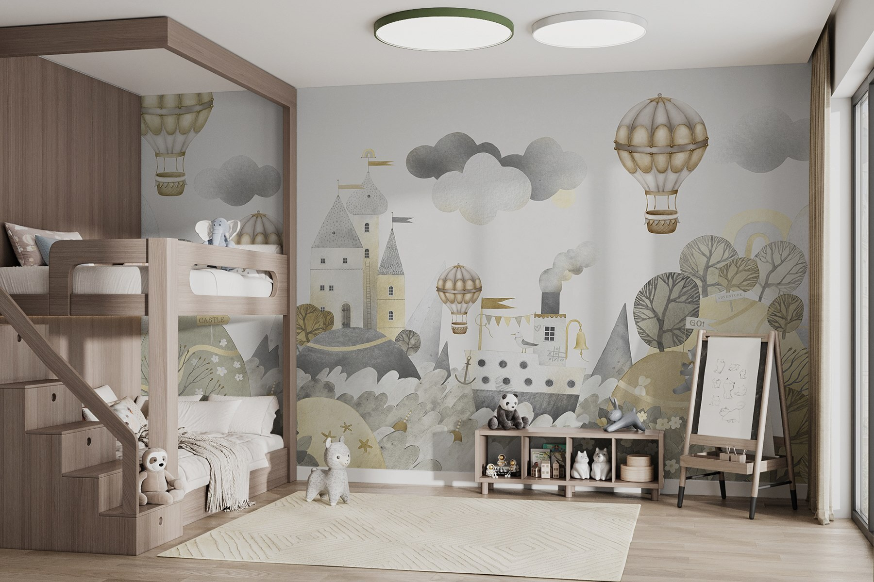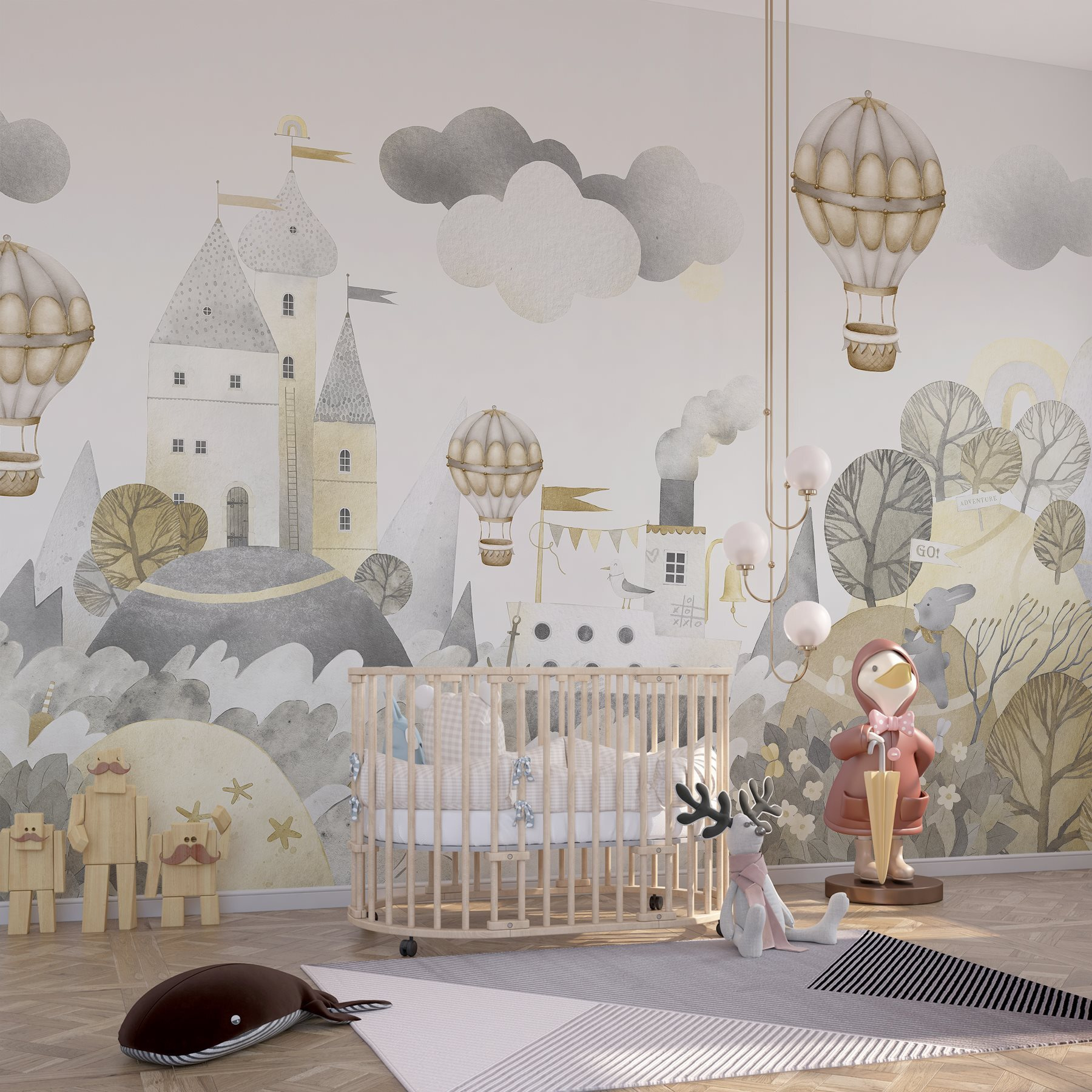 Transforma una habitación en una aventura fantástica con este encantador mural en acuarela que representa un castillo de ensueño y unos preciosos globos aerostáticos. Imagina a los niños vagando por tierras encantadas, con su imaginación volando tan alto como esos globos. Los colores suaves y los detalles encantadores crean un ambiente acogedor y a la vez amplio, perfecto para salas de juegos o guarderías. Imagina esos momentos tranquilos, leyendo cuentos bajo la mirada de un castillo acogedor. Casi podrás oír el suave zumbido de los globos y las risas de los más pequeños mientras exploran su nuevo reino. Cada mirada a este mural promete una chispa de alegría e inspiración. ¿Quién no querría sumergirse en este cuento de hadas?