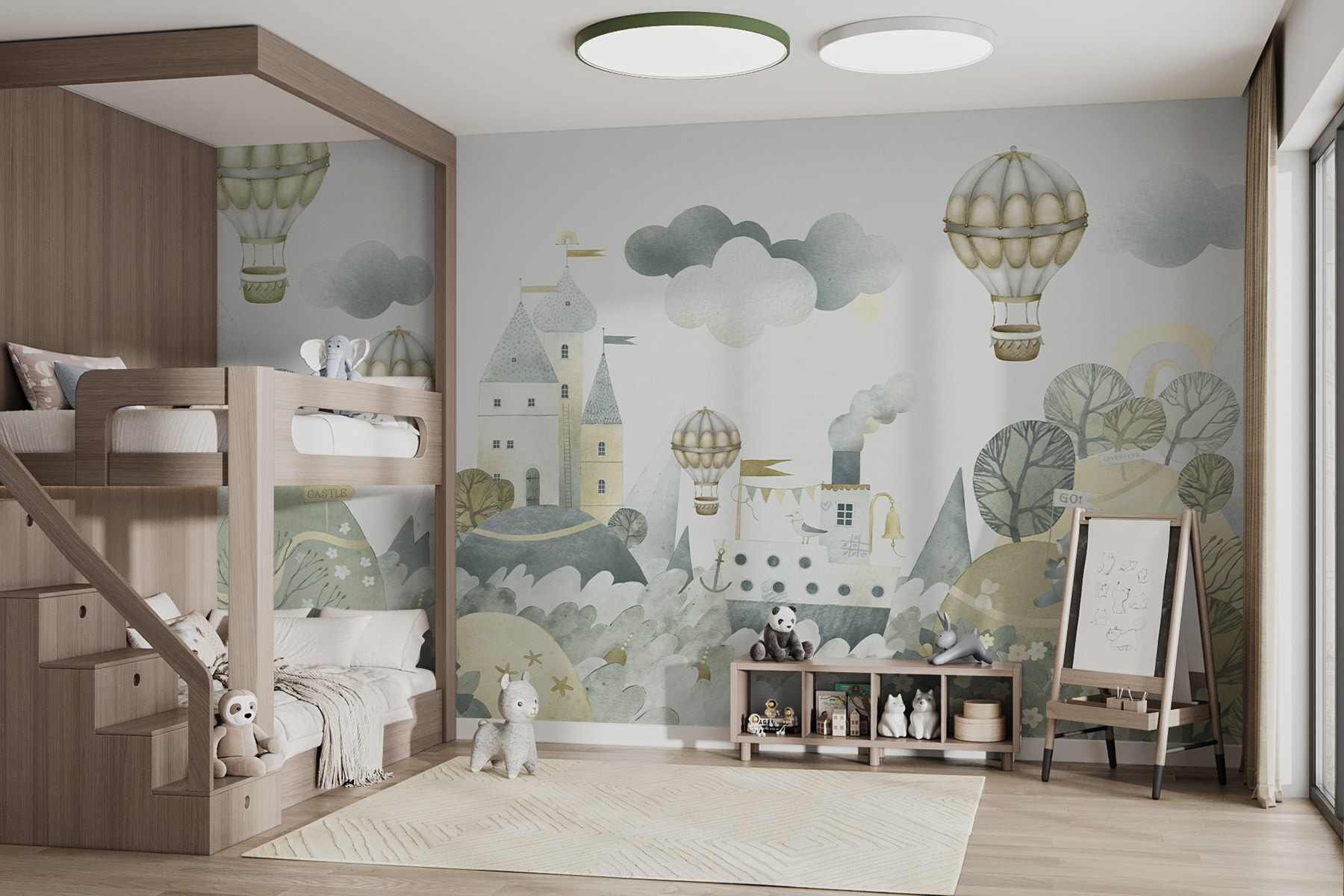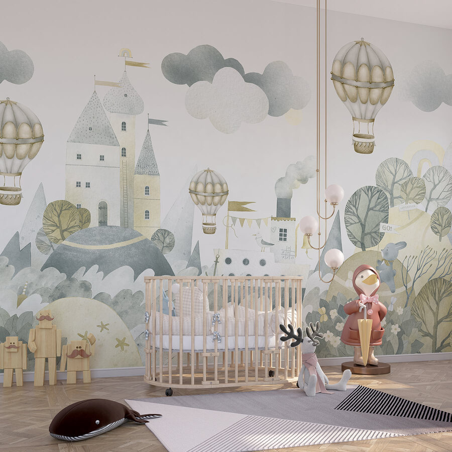 Transforme su espacio con este caprichoso mural que presenta una serena escena de acuarela de un castillo rodeado de encantadores globos aerostáticos. Es como entrar en un libro de cuentos de ensueño, donde las aventuras esperan más allá de las colinas. Imagínese una tarde acogedora, tomando el té mientras contempla los encantadores colores y las suaves nubes a la deriva. Cada globo parece susurrar historias de tierras lejanas, inspirando ensoñaciones y ansias de viajar. Perfecto para la habitación de un niño o para una sala de estar alegre, este mural añade un toque de magia que puede alegrar el día a cualquiera. ¿Por qué no dejar volar la imaginación?