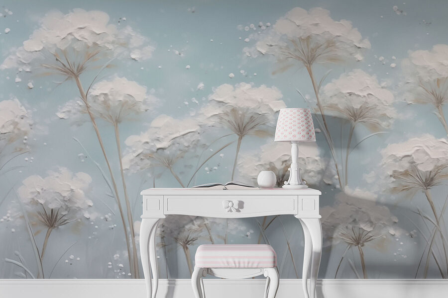 Transforme cualquier pared con este encantador mural que trae campos de flores a su hogar. Imagínese un sereno telón de fondo azul salpicado de delicadas flores que se mecen suavemente con una ligera brisa. Es como entrar en una ensoñación o percibir el aroma de una fresca mañana de primavera. Este mural invita a la calidez y la calma, por lo que es perfecto tanto para rincones de lectura acogedores como para salones animados. Imagínese tomando el té o compartiendo risas en un espacio que parece un abrazo de la naturaleza: suave, acogedor e infinitamente alegre. Perfecto para quienes adoran un toque de fantasía equilibrado con elegancia.