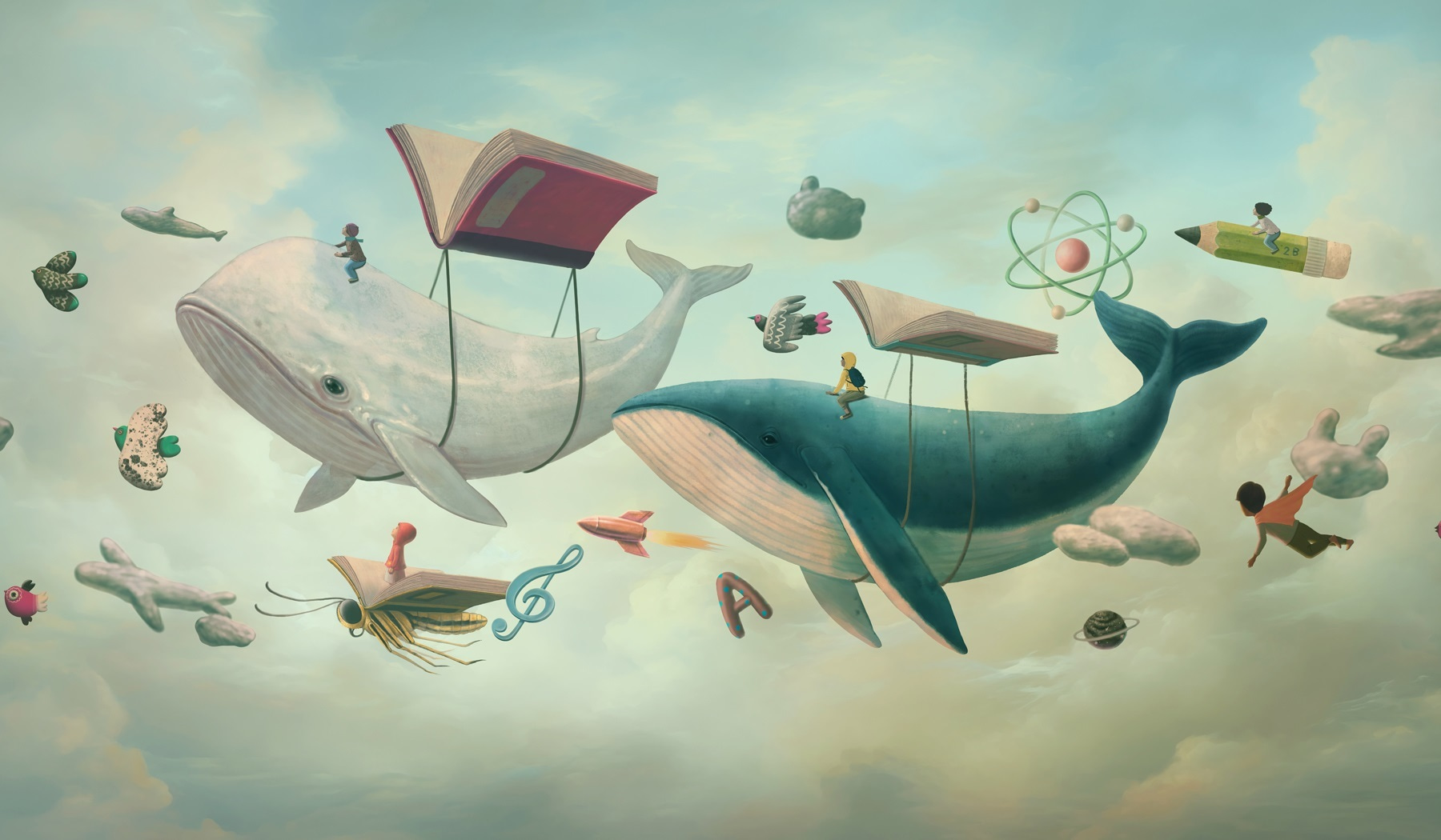Transforme su espacio con el caprichoso encanto de este mural de pared que presenta caprichosas ballenas surcando un cielo de ensueño. Estos gentiles gigantes, flotando con libros, invitan a la imaginación y la aventura en cualquier habitación. Es como entrar en una historia donde la lectura conduce a viajes inesperados, por lo que es perfecto para espacios infantiles o rincones de lectura acogedores. Imagine esto: un niño curioso, perdido en sus pensamientos, mientras el mural despierta sueños de búsquedas oceánicas y exploración cósmica. No es sólo decoración; es una escapada lúdica que convierte tus paredes en un lienzo de creatividad. Además, ¿a quién no le gustaría tener un amigo ballena que le haga compañía mientras lee?