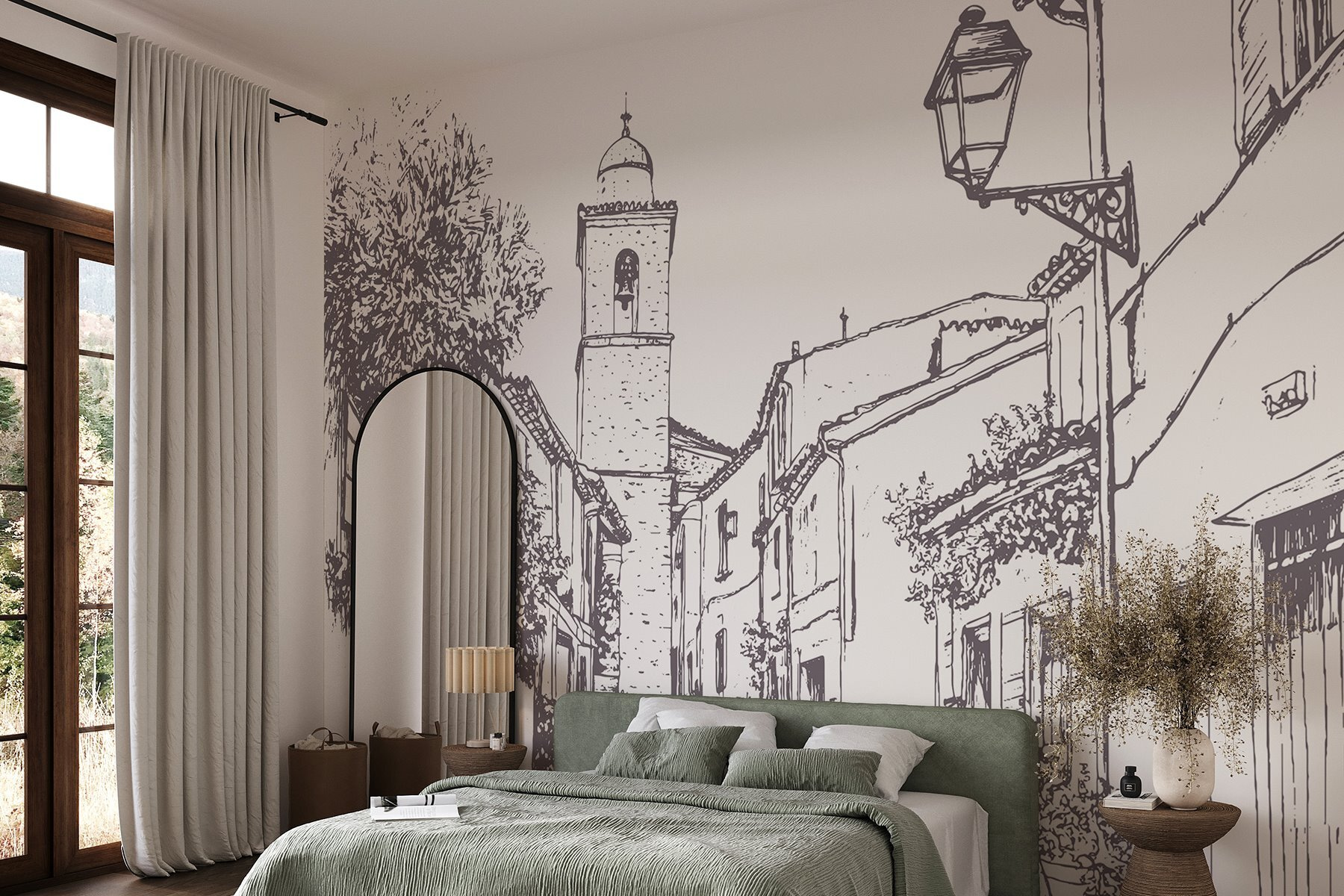 Transforme cualquier pared con este encantador mural de una pintoresca escena callejera. Imagínatelo: un sinuoso camino bordeado de fachadas de edificios y un encantador campanario, todo ello envuelto en un bonito estilo de boceto. Es como una mini escapada cada vez que pasas por allí. Imagina que coges un café, te sientas en ese rincón acogedor que has creado y dejas que tu mente se pasee por ese pintoresco camino. Las plantas que trepan por los edificios añaden un toque de vida, dando una sensación de calidez y nostalgia. Esta pieza no es sólo decoración; es una invitación a soñar despierto con calles soleadas y aventuras a la vuelta de la esquina. Perfecta para quienes buscan un toque de fantasía en su espacio.