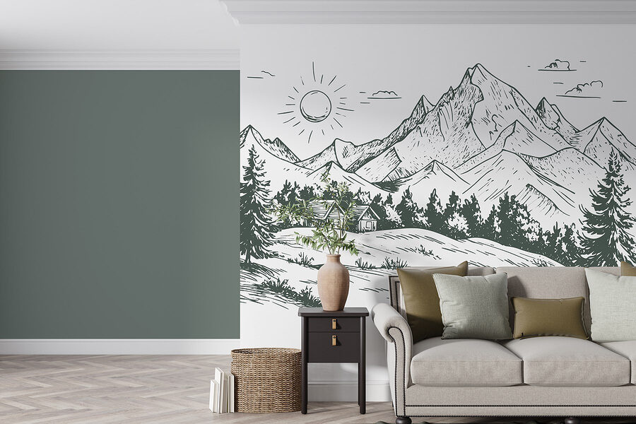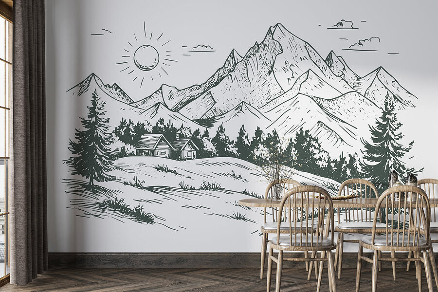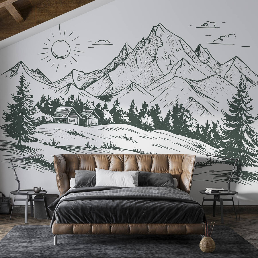 Transforme una pared en blanco en una escapada serena con este cautivador mural que muestra una encantadora casa enclavada entre grandes montañas y frondosos árboles. Imagínese despertarse con un suave recordatorio de la belleza de la naturaleza en su salón u oficina. Las líneas nítidas y los tonos tierra crean un ambiente tranquilo, perfecto para relajarse después de un largo día. Es como llevar un poco de la naturaleza al interior, pero sin mosquitos. Tanto si se trata de un acogedor rincón de lectura como de un espacio para invitar a los amigos, este mural crea ambiente. ¿Quién no querría sentirse un poco más zen en su día a día?