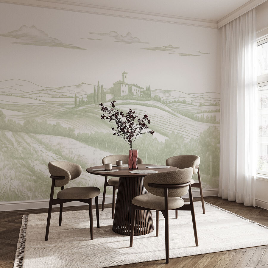 Transforme cualquier habitación en una escapada tranquila con este hermoso mural de pared que muestra un paisaje sereno. Imagine esas suaves colinas ondulantes, una encantadora casa abrazando el paisaje y campos que se extienden como un cálido abrazo. Evoca ese viaje de ensueño de fin de semana al campo, perfecto para hacer que la rutina diaria parezca un poco menos, bueno, aburrida. Los tonos suaves aportan una calma difícil de resistir. Es como invitar al aire fresco y a la tranquilidad de la naturaleza a tu casa, sin alergias ni picaduras de insectos. ¿Quién no querría un trocito de paraíso para contemplar mientras se toma un café?