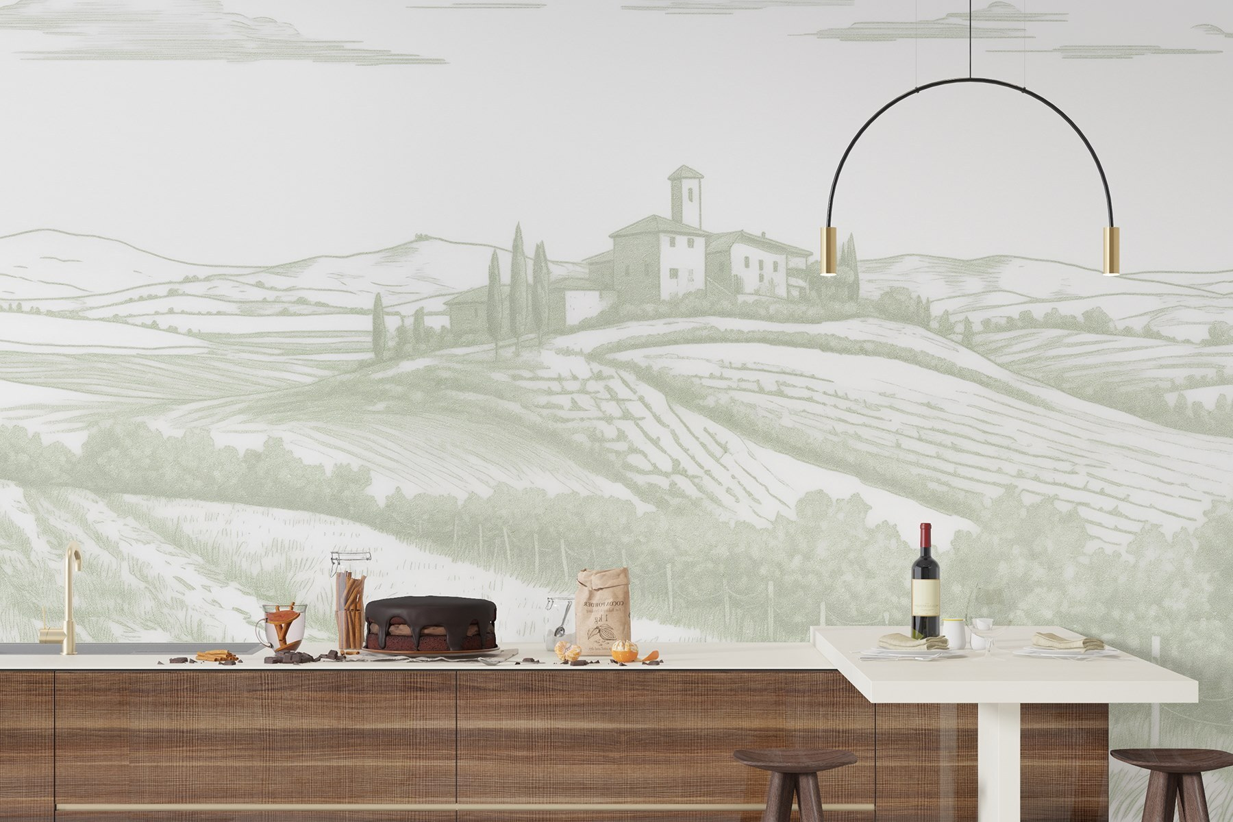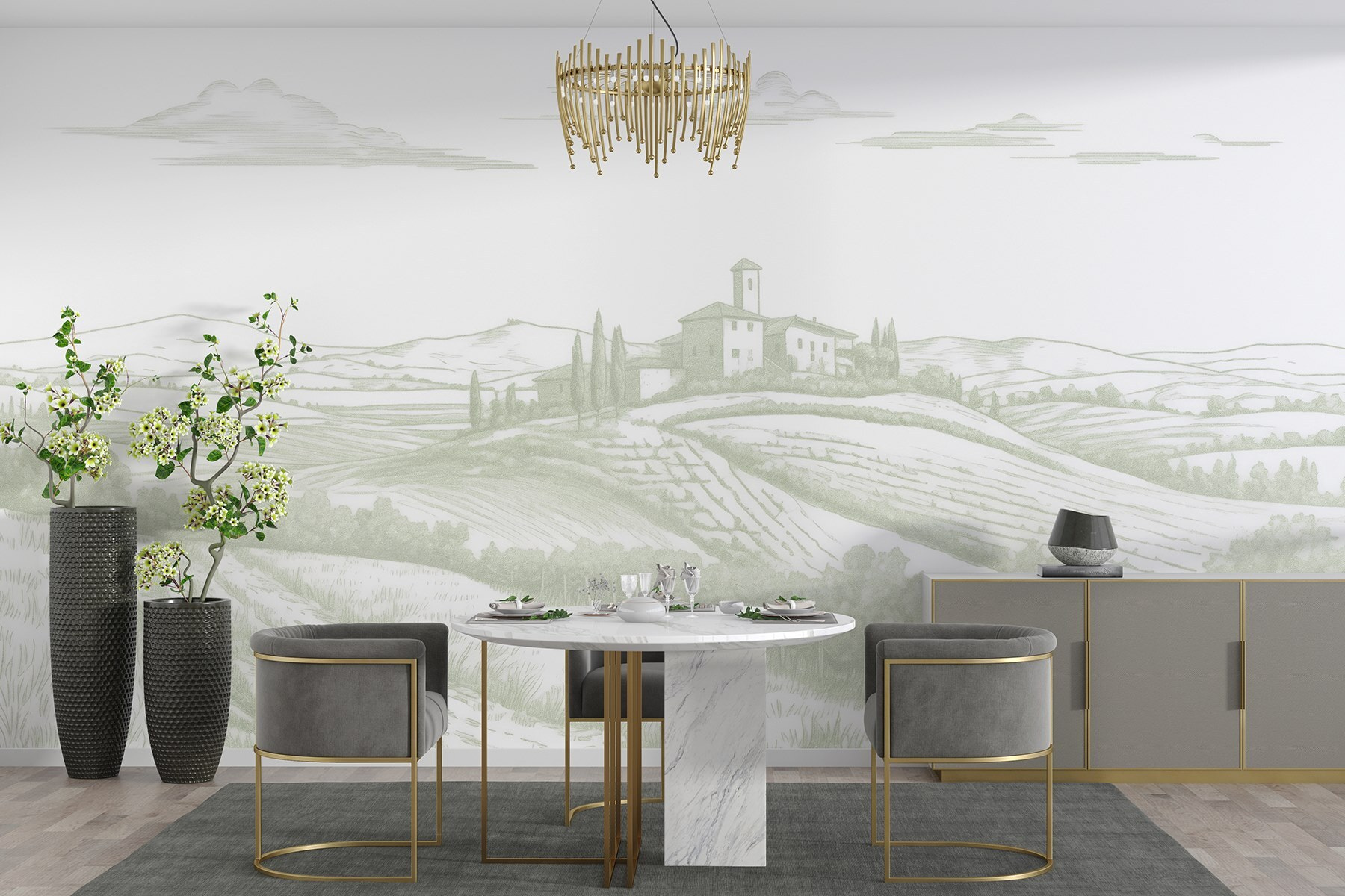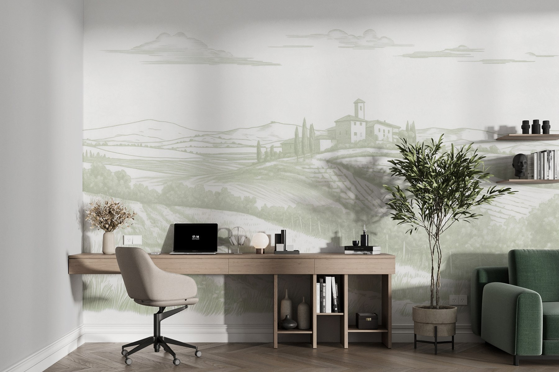 Transforme cualquier habitación en una escapada tranquila con este hermoso mural de pared que muestra un paisaje sereno. Imagine esas suaves colinas ondulantes, una encantadora casa abrazando el paisaje y campos que se extienden como un cálido abrazo. Evoca ese viaje de ensueño de fin de semana al campo, perfecto para hacer que la rutina diaria parezca un poco menos, bueno, aburrida. Los tonos suaves aportan una calma difícil de resistir. Es como invitar al aire fresco y a la tranquilidad de la naturaleza a tu casa, sin alergias ni picaduras de insectos. ¿Quién no querría un trocito de paraíso para contemplar mientras se toma un café?