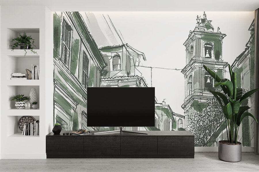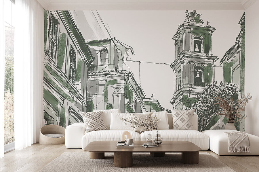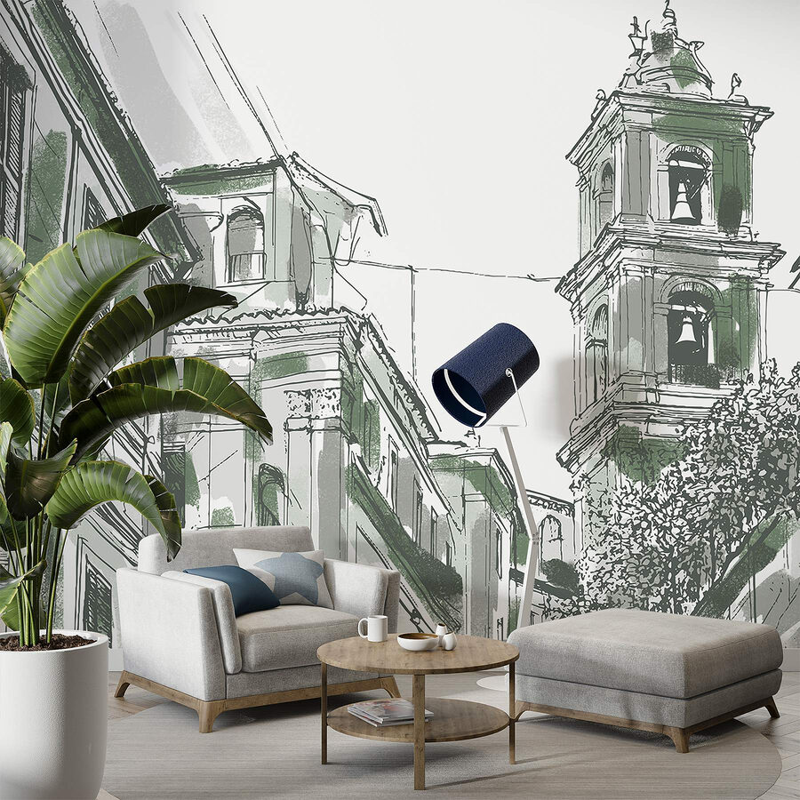 Aporte un toque de encanto urbano a su espacio con este encantador mural de pared. Imagínatelo: un cautivador dibujo de un edificio adornado con campanas, que susurra historias de una bulliciosa vida urbana. Los suaves verdes y las intrincadas líneas le invitan a asomarse a un paisaje urbano sereno pero lleno de vida, despertando la imaginación. Imagínese tomando un café, contemplando este mural y sintiendo la calidez de la comunidad y la historia que le rodea. Perfecto para salones, cafeterías o acogedores rincones de lectura, aporta personalidad sin sobrecargar el espacio. Es como tener un trocito de la magia de la ciudad en casa.