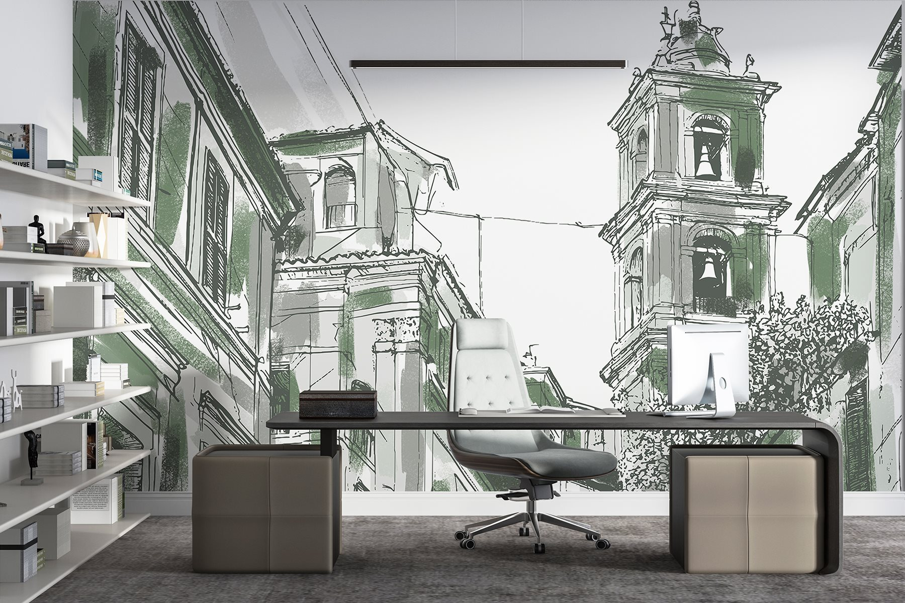 Aporte un toque de encanto urbano a su espacio con este encantador mural de pared. Imagínatelo: un cautivador dibujo de un edificio adornado con campanas, que susurra historias de una bulliciosa vida urbana. Los suaves verdes y las intrincadas líneas le invitan a asomarse a un paisaje urbano sereno pero lleno de vida, despertando la imaginación. Imagínese tomando un café, contemplando este mural y sintiendo la calidez de la comunidad y la historia que le rodea. Perfecto para salones, cafeterías o acogedores rincones de lectura, aporta personalidad sin sobrecargar el espacio. Es como tener un trocito de la magia de la ciudad en casa.