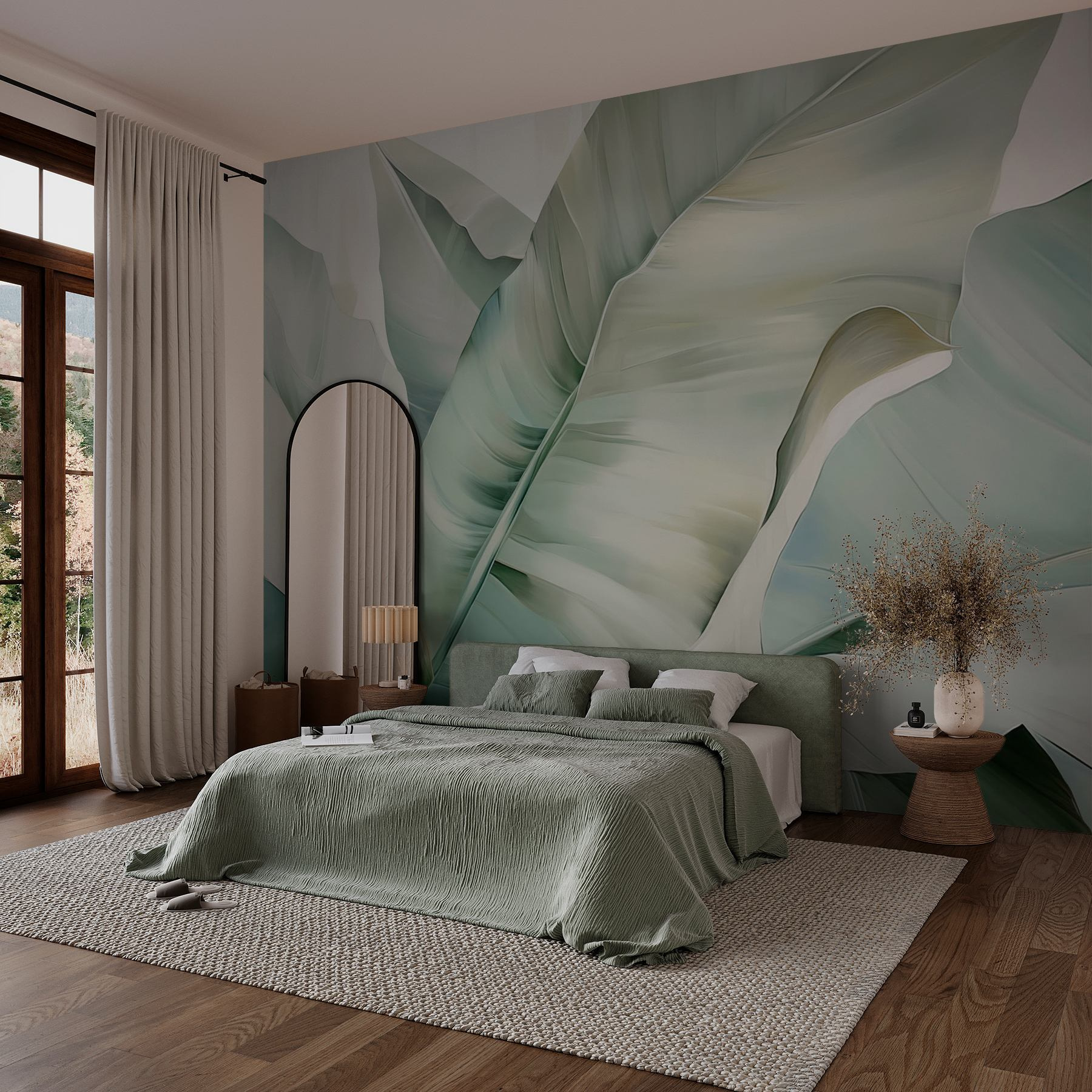 Transformar un espacio puede ser tan fácil como desplegar unas exuberantes hojas en tonos suaves. Este mural no es sólo para las paredes; es como invitar a una escapada tropical directamente al salón. Imagínese tomando una copa, con los verdes vibrantes revoloteando a su alrededor, y soñando despierto con playas soleadas, sin la arena en los zapatos. Los colores suaves crean un ambiente tranquilo, por lo que es perfecto para un rincón de lectura acogedor o una zona de relax. Además, ¡es como si tu pared acabara de recibir un filtro digno de Instagram! ¿A quién no le gustaría tener un telón de fondo en el que sentirse como en unas minivacaciones?