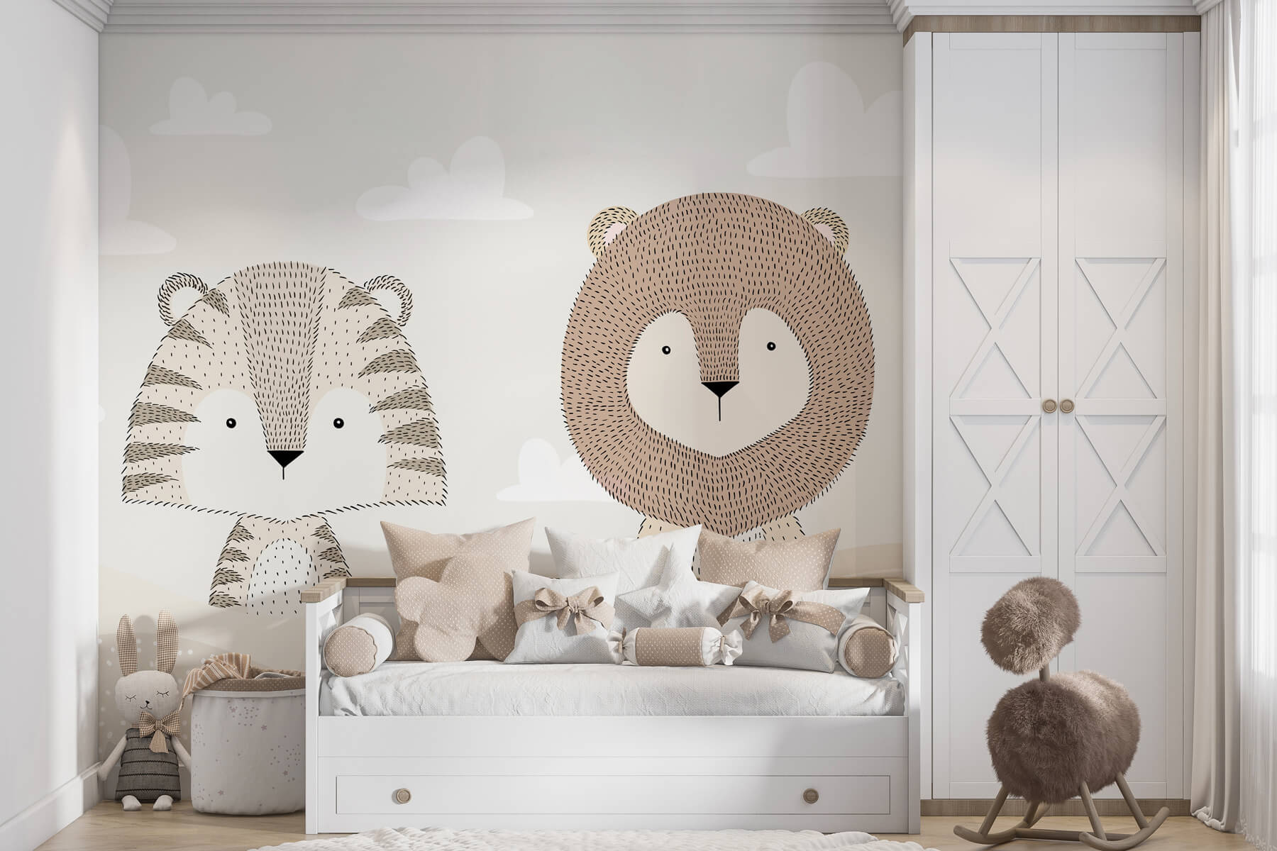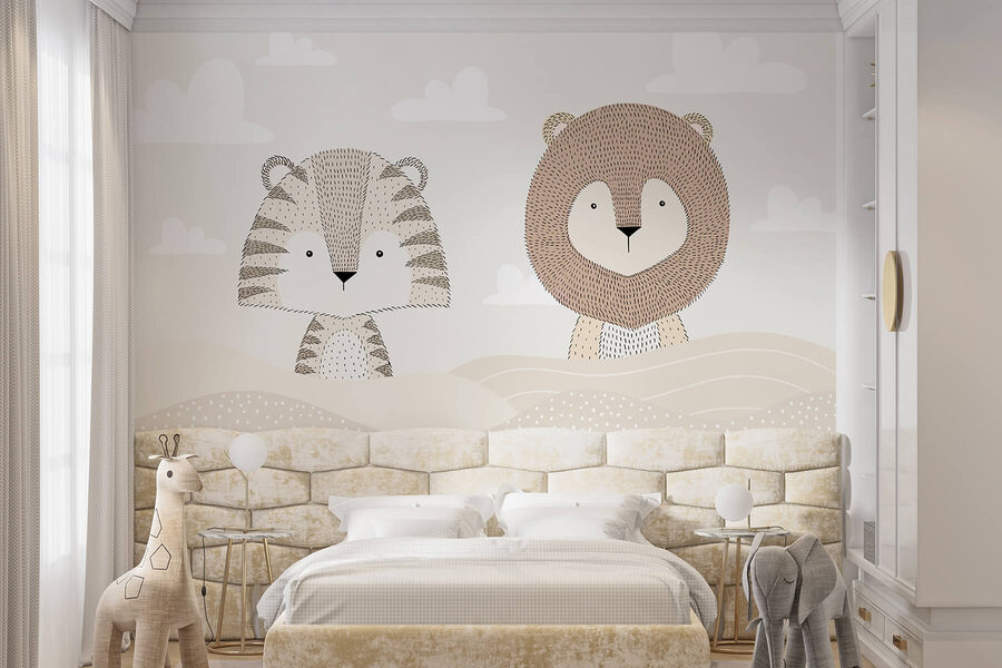 Aporta un toque de aventura al mundo de los más pequeños con este encantador mural de pared en el que aparecen un león y un tigre descansando en un sereno paisaje desértico. Es como unas vacaciones tropicales en tus paredes. Los colores suaves crean un ambiente tranquilo, perfecto para soñar durante el día o acurrucarse por la noche. Imagina historias de aventuras en la selva a la hora de dormir bajo estos encantadores bichos: los más pequeños se quedarán dormidos pensando en juguetonas aventuras. Un héroe y un amigo, este mural hace que cada habitación parezca un poco más mágica. Perfecto para espacios infantiles o guarderías, añade diversión y calidez. Además, ¿a quién no le gustan un par de adorables amigos animales?