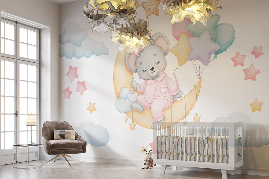Transforma cualquier habitación en una escapada de ensueño con este encantador mural de pared en el que aparece un ratón acurrucado en la luna, agarrado a globos de colores. Imagina un suave resplandor iluminando esas pequeñas estrellas, mientras tu pequeño se duerme soñando con caprichosas aventuras entre las nubes. Es como un cuento para dormir que cobra vida, ¡perfecto para guarderías o cuartos de juegos! La paleta de colores pastel crea una atmósfera relajante, por lo que es fácil imaginar todas las risas y dulces sueños que esta encantadora escena podría inspirar. Añade una pizca de magia a las paredes y ¡deja volar la imaginación!