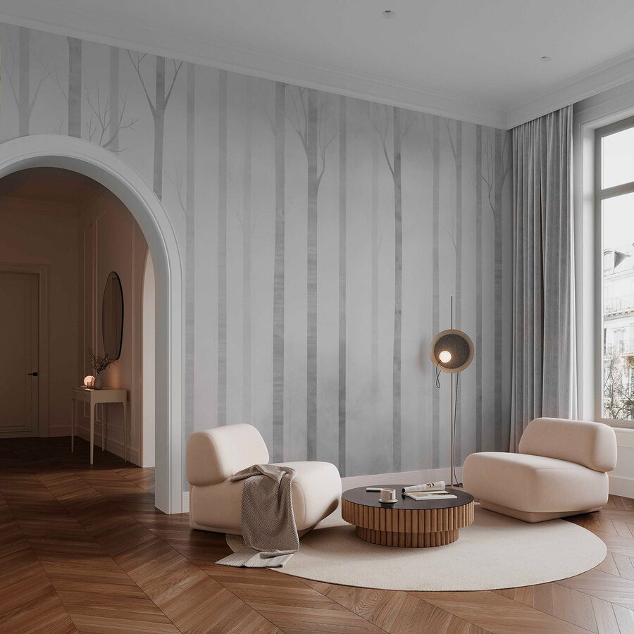 Imagínese adentrarse en un bosque de ensueño, envuelto en un suave manto de niebla. Este mural de pared, con un tranquilo grupo de árboles a la deriva en la niebla, crea un ambiente sereno que es difícil de resistir. Es perfecto para añadir un toque frío inspirado en la naturaleza a cualquier habitación, como una acogedora escapada a una cabaña sin salir de casa. Imagínatelo en un rincón de lectura donde se pueda tomar una taza de té humeante, o detrás de un cómodo sofá, invitando a pasar tardes perezosas. Los sutiles tonos grises mantienen la calma, mientras que los árboles susurran historias de paseos por el bosque. Lleva un trozo de naturaleza al interior y deja que cada mirada despierte un poco de paz y asombro.