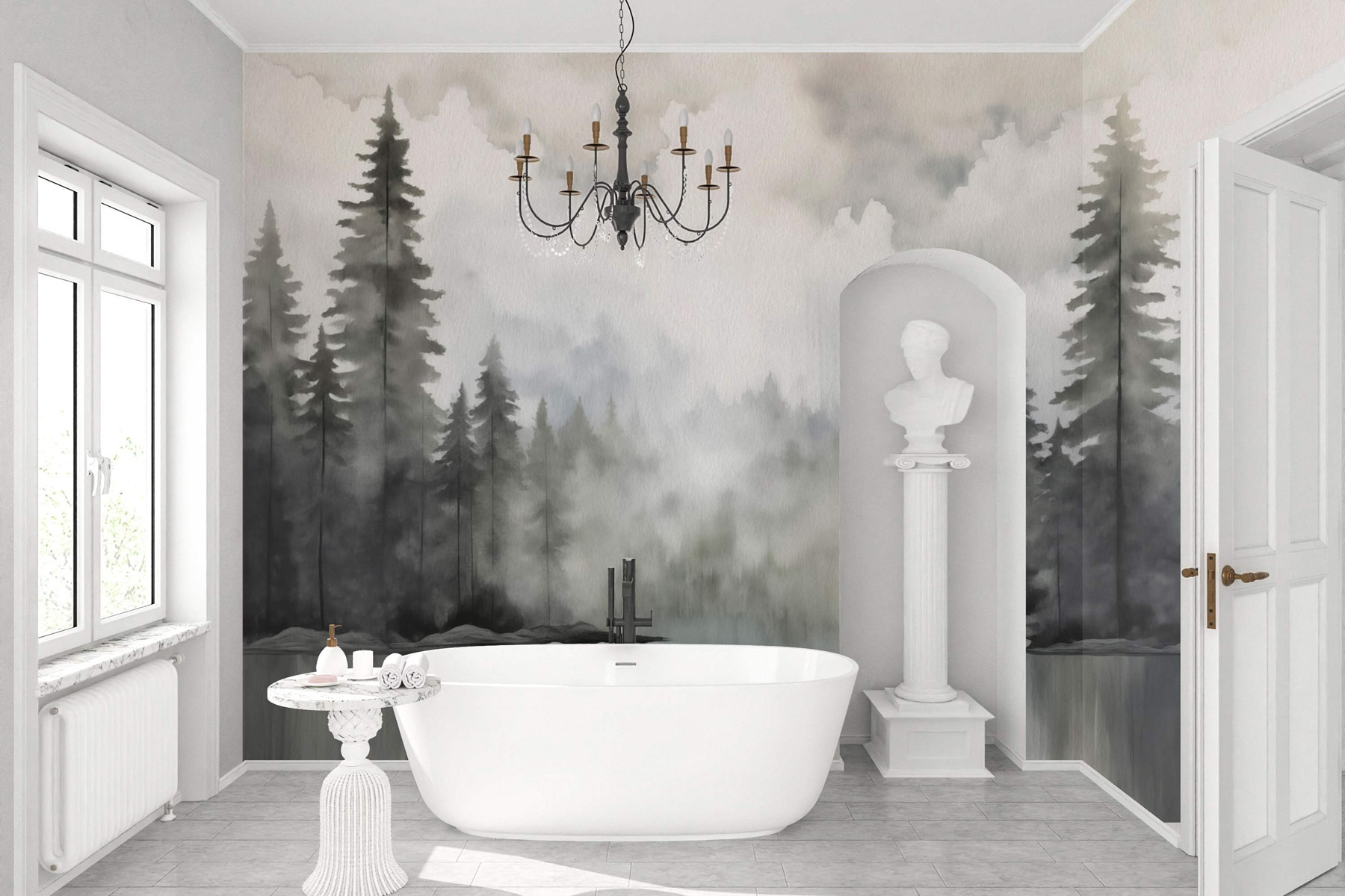 Transforme cualquier espacio con este impresionante mural de acuarela de un bosque y un lago sereno. Imagínese entrar en una habitación y sentir que ha entrado directamente en el abrazo de la naturaleza. Los suaves tonos grises y verdes ofrecen una vibración calmante, perfecta para crear un refugio tranquilo en su hogar.