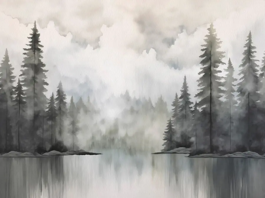 Transforme cualquier espacio con este impresionante mural de acuarela de un bosque y un lago sereno. Imagínese entrar en una habitación y sentir que ha entrado directamente en el abrazo de la naturaleza. Los suaves tonos grises y verdes ofrecen una vibración calmante, perfecta para crear un refugio tranquilo en su hogar.