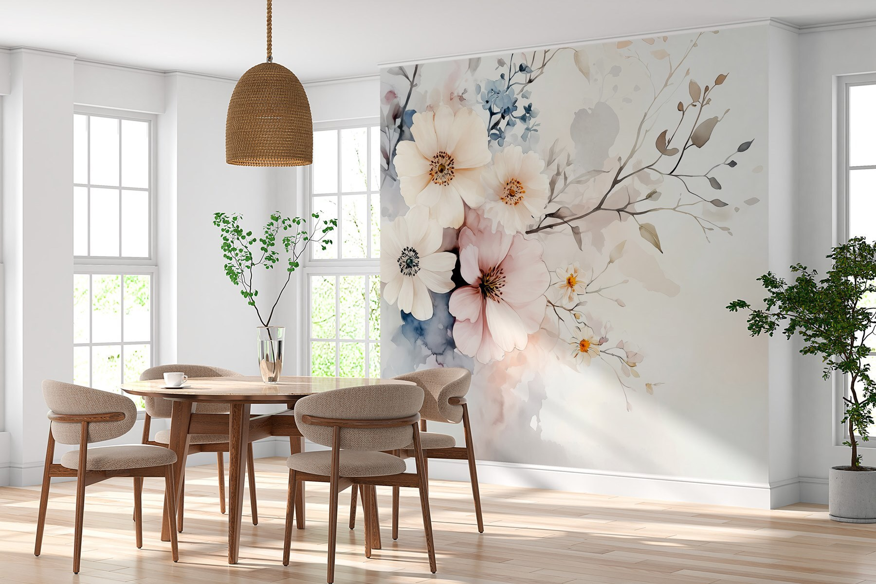 Transforme cualquier habitación con este magnífico mural de pared, que presenta un arreglo de flores de ensueño sobre un suave fondo blanco. Imagínese despertarse cada día con flores rosas y verdes suaves que parecen un paseo por un jardín sereno. Perfecto para salones o rincones acogedores, añade un toque de elegancia sin ser demasiado llamativo. Los amigos pueden incluso detenerse durante una charla, cautivados por la obra de arte. Atrae las miradas y eleva el espíritu, perfecto para dejar entrar algunas vibraciones positivas. ¿Quién iba a decir que las flores podían alegrar tanto una habitación como un jardín?