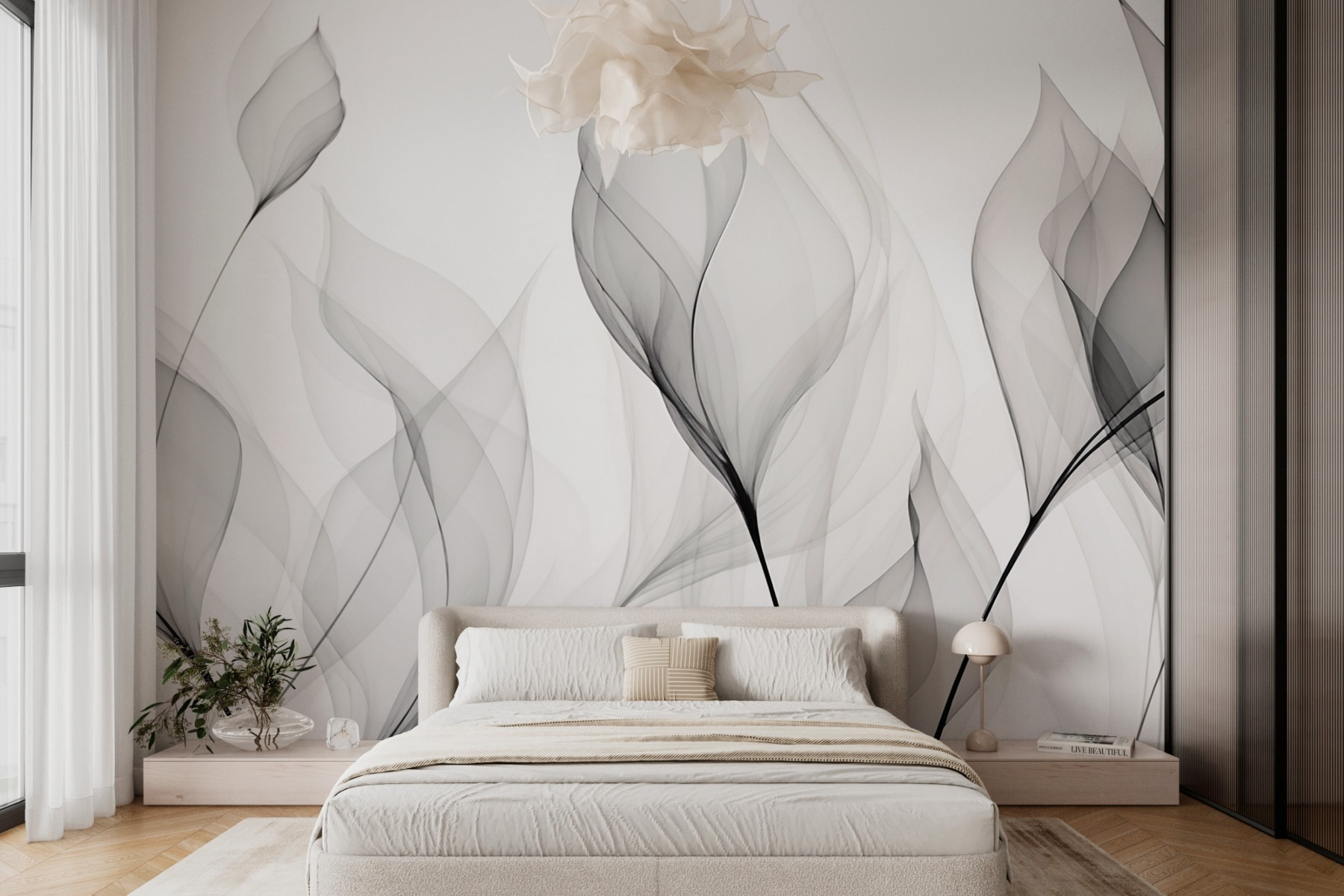 Transforme cualquier pared en una escapada de ensueño con este impresionante mural en blanco y negro con elegantes flores. Es como entrar en una suave brisa floral cada vez que pasas por delante. El delicado diseño aporta una sensación de calma y serenidad, perfecta para un acogedor rincón de lectura o un animado salón. Imagina que te acurrucas con un libro, rodeado de estas elegantes flores; de repente, el mundo exterior se desvanece. Ya sea añadiendo un toque suave a un espacio moderno o realzando un ambiente clásico, este mural hace que una habitación se sienta viva pero relajada. Una pizca del encanto de la naturaleza para su hogar.