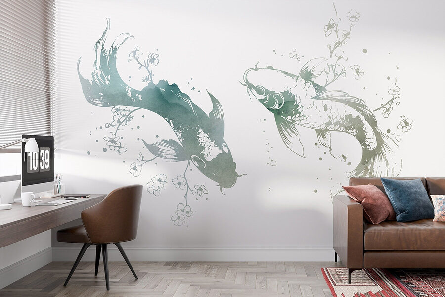 Transforme su espacio en una escapada serena con este cautivador mural en el que aparecen dos graciosos peces rodeados de delicadas flores y hojas. Imagina que entras en la habitación y ahí están, deslizándose entre suaves acuarelas que dan vida a tus paredes. Es como tener un trocito de naturaleza en casa, que invoca una sensación de calma con cada mirada.