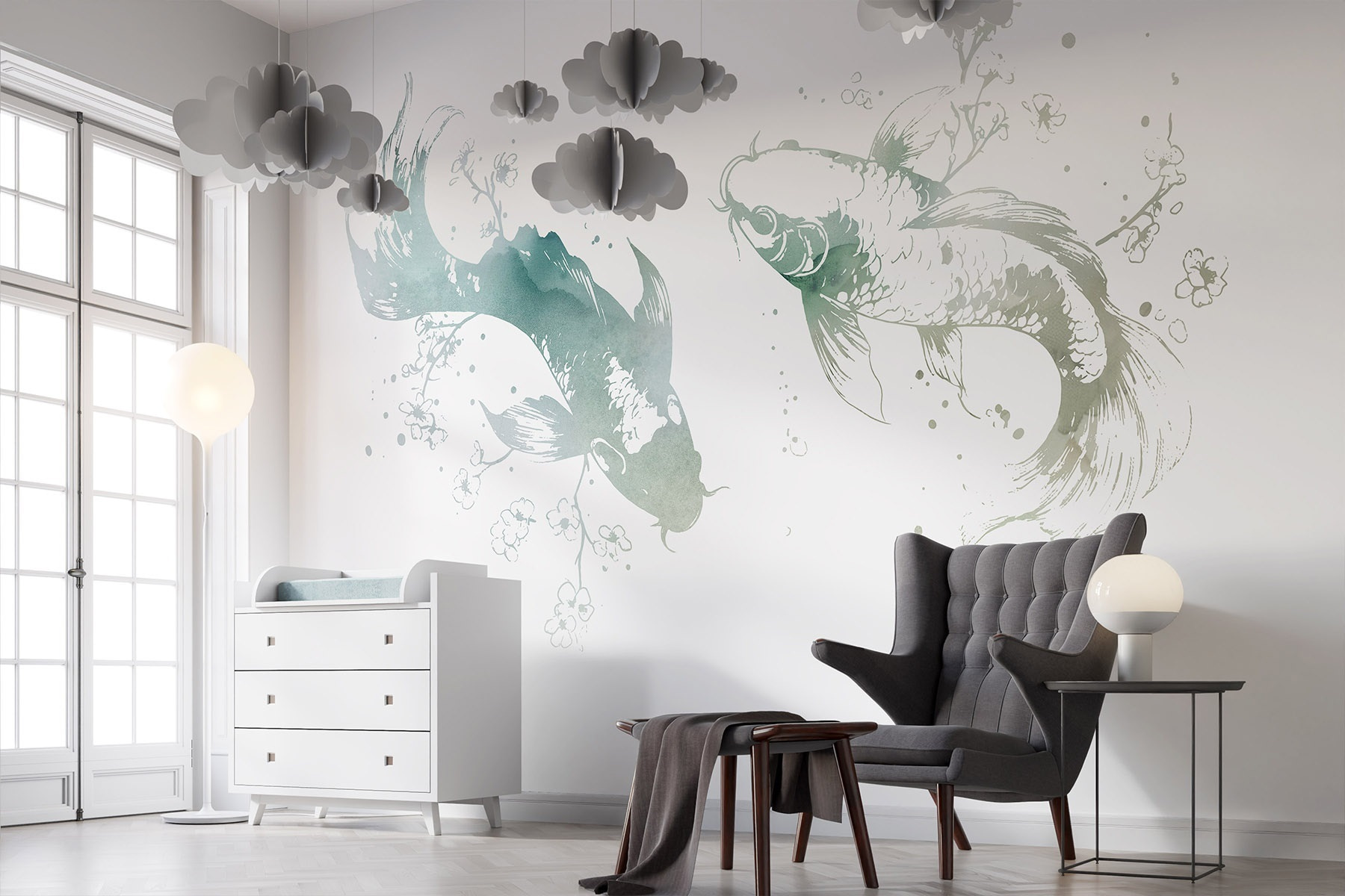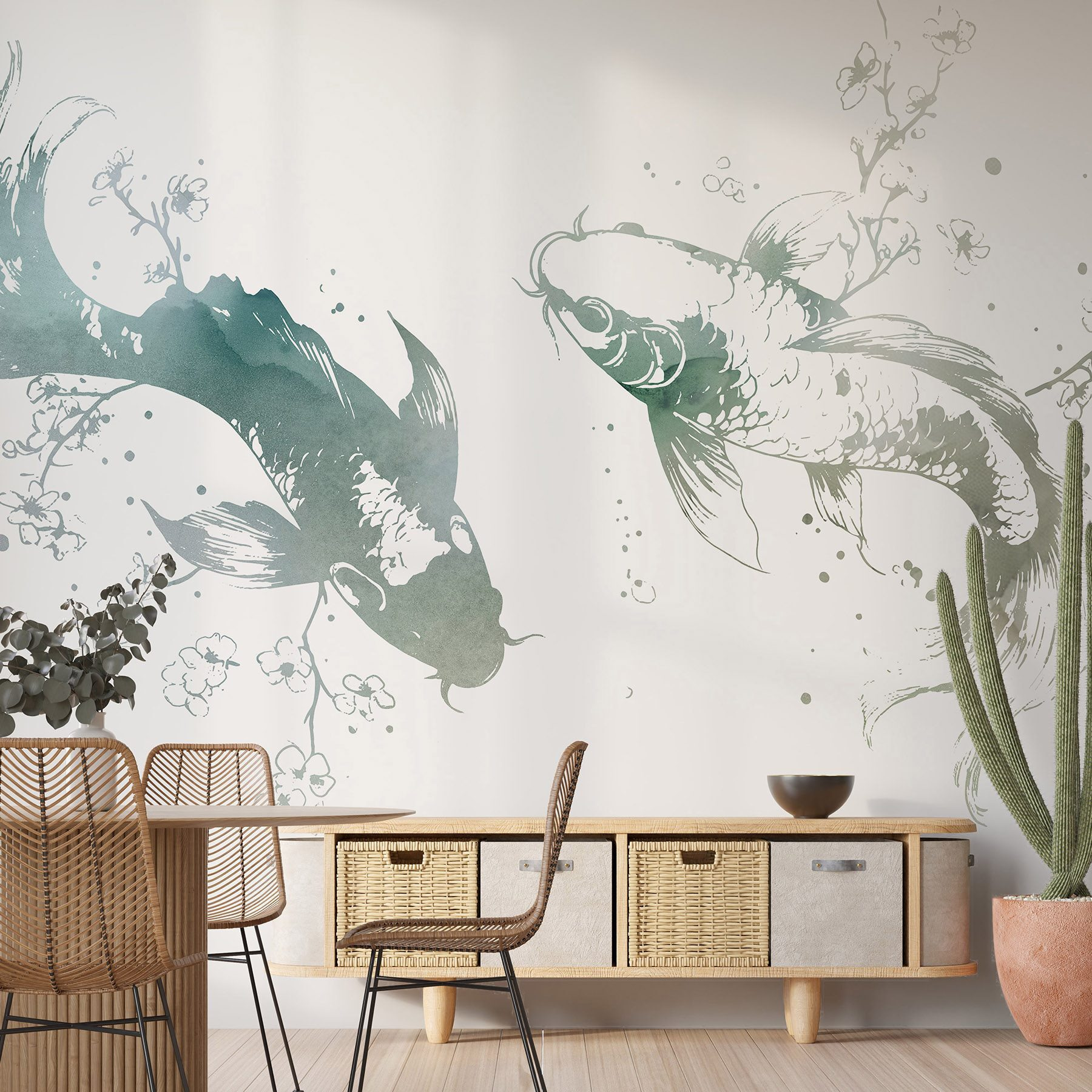 Transforme su espacio en una escapada serena con este cautivador mural en el que aparecen dos graciosos peces rodeados de delicadas flores y hojas. Imagina que entras en la habitación y ahí están, deslizándose entre suaves acuarelas que dan vida a tus paredes. Es como tener un trocito de naturaleza en casa, que invoca una sensación de calma con cada mirada.