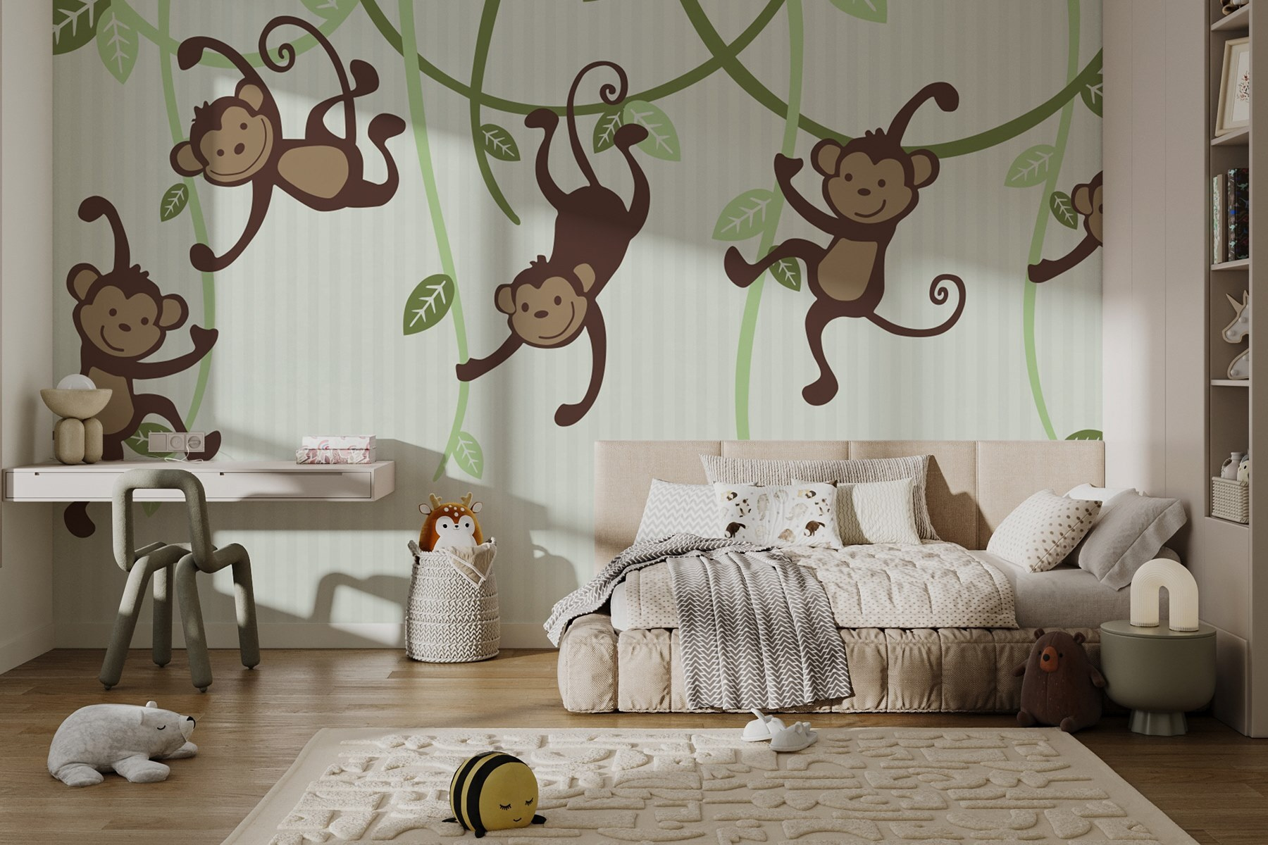 Transforma cualquier espacio con este divertido mural de pared con un grupo de monos descarados columpiándose de lianas. Imagínatelo: acurrucado en la habitación de juegos o la guardería de un niño, rodeado de estos adorables alborotadores. Aportan un estallido instantáneo de alegría y picardía, recordando a todos que la vida debe ser divertida. Ya sea a la hora del cuento o simplemente en una tarde de ocio, estos monos pueden despertar las risas y la imaginación. Los suaves verdes y marrones encajan perfectamente en cualquier decoración, creando un ambiente cálido y acogedor. Con sólo un vistazo, es difícil no sonreír. Perfectos para dar un toque de fantasía a tus paredes.