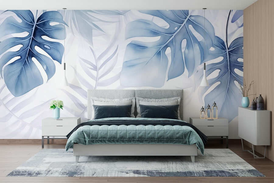 Fotomurales Fondo azul y blanco con hojas