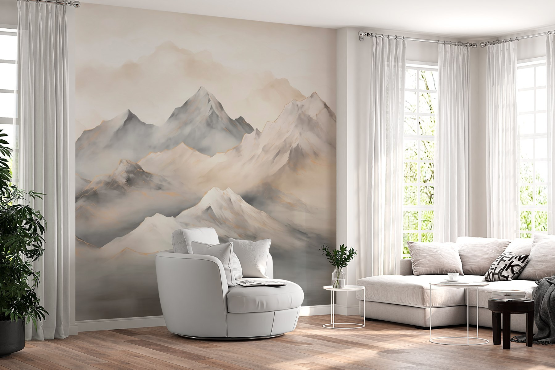 Transforme cualquier habitación en un acogedor refugio con este impresionante mural de montañas envueltas en suaves nubes. Imagínese entrar en su espacio y sentir que ha entrado en un paisaje sereno, el escape perfecto del ajetreo y el bullicio. El suave estilo de acuarela crea un ambiente relajante, ¿y esos tonos apagados? Combinan a la perfección con casi cualquier decoración. Es como colgar un trozo de naturaleza en la pared. Perfecto para crear un ambiente relajado durante los fines de semana de ocio o simplemente como telón de fondo para una acogedora noche de cine. No dudes de que no te faltarán cumplidos: ¡la gente se preguntará si te has convertido en fotógrafo de naturaleza de la noche a la mañana!