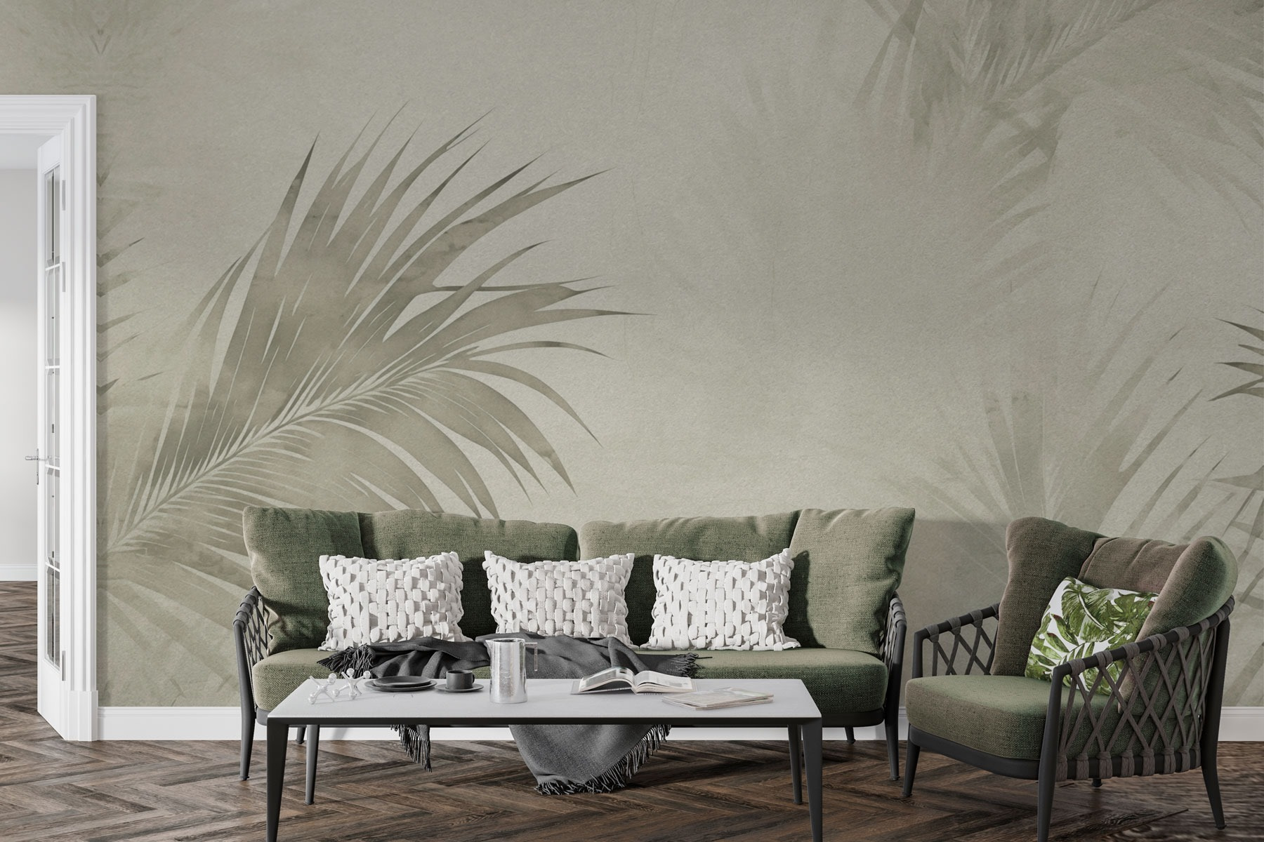 Transforma cualquier habitación en una escapada tropical con este mural de suaves hojas de palmera sobre un relajante fondo neutro. Es como traer un trozo de paraíso a su hogar. Imagínese descansando con un libro, rodeado de esos verdes suaves, bebiendo algo refrescante. Gracias a sus colores discretos, combinará sin esfuerzo con tu decoración actual, ofreciendo un ambiente tranquilo sin llamar la atención.
